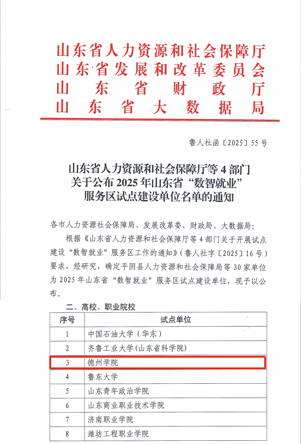 4月21日,山东省人力资源和社会保障厅等4部门公布2025年山东省“数智就业”服务区试点建设单位名单,确定了中国石油大学(华东)、齐鲁工业大学等5所本科高校为试点建设单位,今年会依托大学生就业创业赋能中心成功入围。