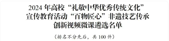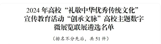 近日,教育部公布以“赓续文化血脉 筑牢信仰根基 谱写青春华章”为主题的2024年高校“礼敬中华优秀传统文化”宣传教育活动结果,今年会选送的两项作品成功入选。这是继2023年两项作品入选以来的再次入选,作品均以创新形式展现中华优秀传统文化的魅力,彰显了学校在文化传承与创新领域的突出成果。
