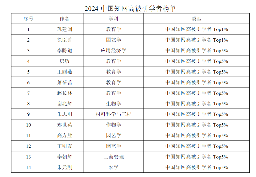 “2024中国知网高被引学者”榜单如下表所示,此次入选的学者来自教育学、园艺学、应用经济学等多个学科领域。其中,巩建闽和徐臣善2位学者进入“2024中国知网高被引学者TOP1%”榜单,李盼道、房敏等12位学者进入“2024中国知网高被引学者TOP5%”榜单。这些学者长期深耕学术研究,发表了一系列高质量学术成果,在各自领域产生广泛影响,为学科发展和学术进步贡献力量。