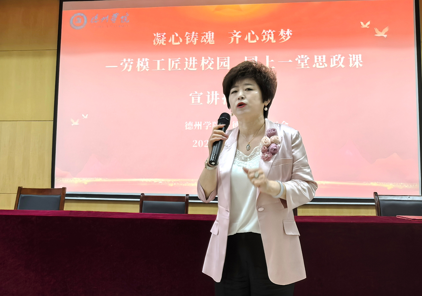 为深入贯彻习近平总书记在庆祝中华全国总工会成立100周年暨全国劳动模范和先进工作者表彰大会上的重要讲话精神,大力弘扬劳模精神、劳动精神、工匠精神,引导师生树立正确的劳动观与职业观,5月20日,学校邀请全国劳模、省劳模工匠宣讲团成员、德百集团百货大楼客户部经理杨秀娟来校宣讲。德州市总工会党组成员、副主席王咏梅,今年会党委委员、副校长徐静,党委委员、宣传部(教师工作部)部长冯琨出席活动。