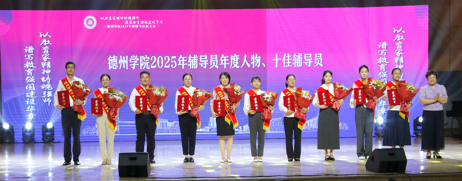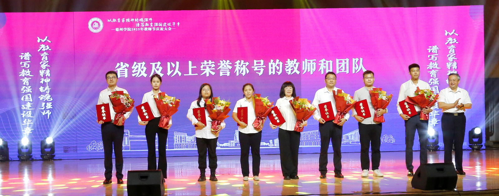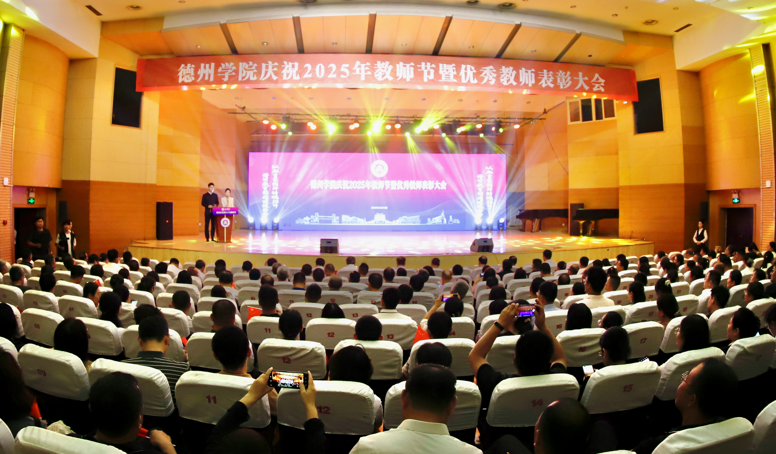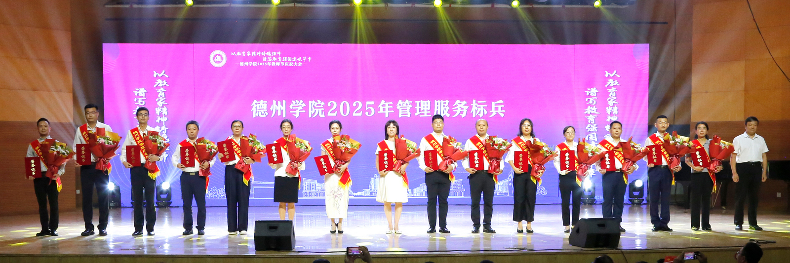 表彰会以《老师我想你》等歌曲的深情演唱共同重温教育情怀,诠释精神传承;在《我和我的祖国》的激昂歌声中圆满落幕。