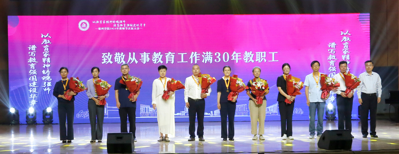 赵长林为获批省级及以上教学成果教师及团队颁奖,为从教满30年教职工代表颁授纪念章。