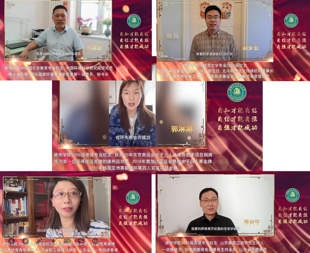 校友代表白英臣、赵步云、郭淋淋、赵琰、乔兴宁、李传涛通过线上方式勉励毕业生牢记“德院人”身份,发扬德院的优良传统,不负韶华,笃定前行。