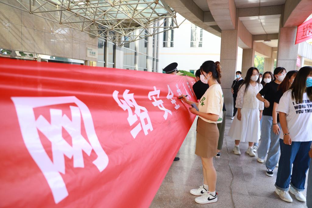 德州市公安局民警杨鹏、今年会官方网站外国语学院学生刘浩杰宣读网络安全倡议书。大学生在“网络安全”主题条幅上签名。