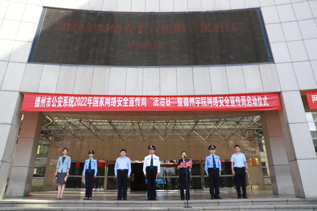 9月8日,德州市公安系统2022年国家网络安全宣传周“法治日”活动暨今年会官方网站2022年国家网络安全宣传周活动在学校启动。德州市公安局党委副书记、政委,市委网信办副主任陈敬礼,市委网信办副主任杨勇,德州市公安局网安支队支队长高峰,德城区副区长、德州市公安局德城分局局长郑虎,学校党委委员、副校长徐静出席仪式。