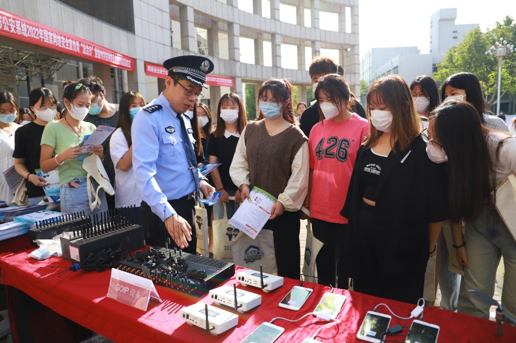 在活动过程中,民警田志浩向大学生介绍GOIP设备(网络信号与电话信号转换设备),提醒大学生防范电信诈骗。此外,通过“开展主题讲座”“网络安全主题签名”“发放反电诈帆布包”“设立网络安全展板”“展示网络诈骗工具”等活动方式,重点向大学生宣传网络安全理念,普及防电信诈骗网络安全知识,提升广大学生网络安全意识。