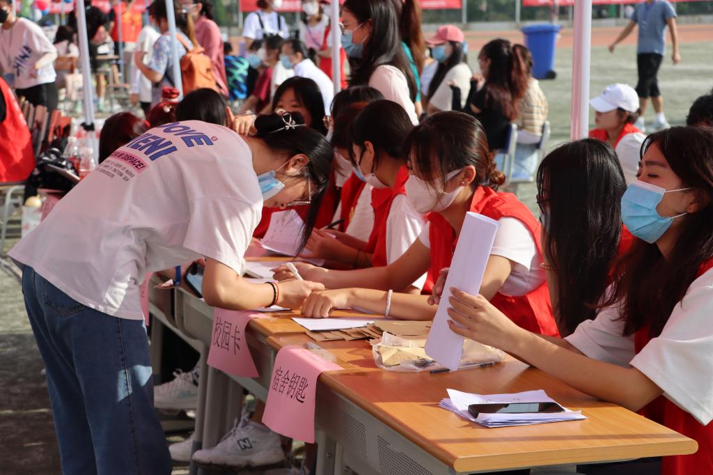 数百名身穿红马甲的学生志愿者为新生提供报到、引导等服务,成为校园一道独特的风景线。