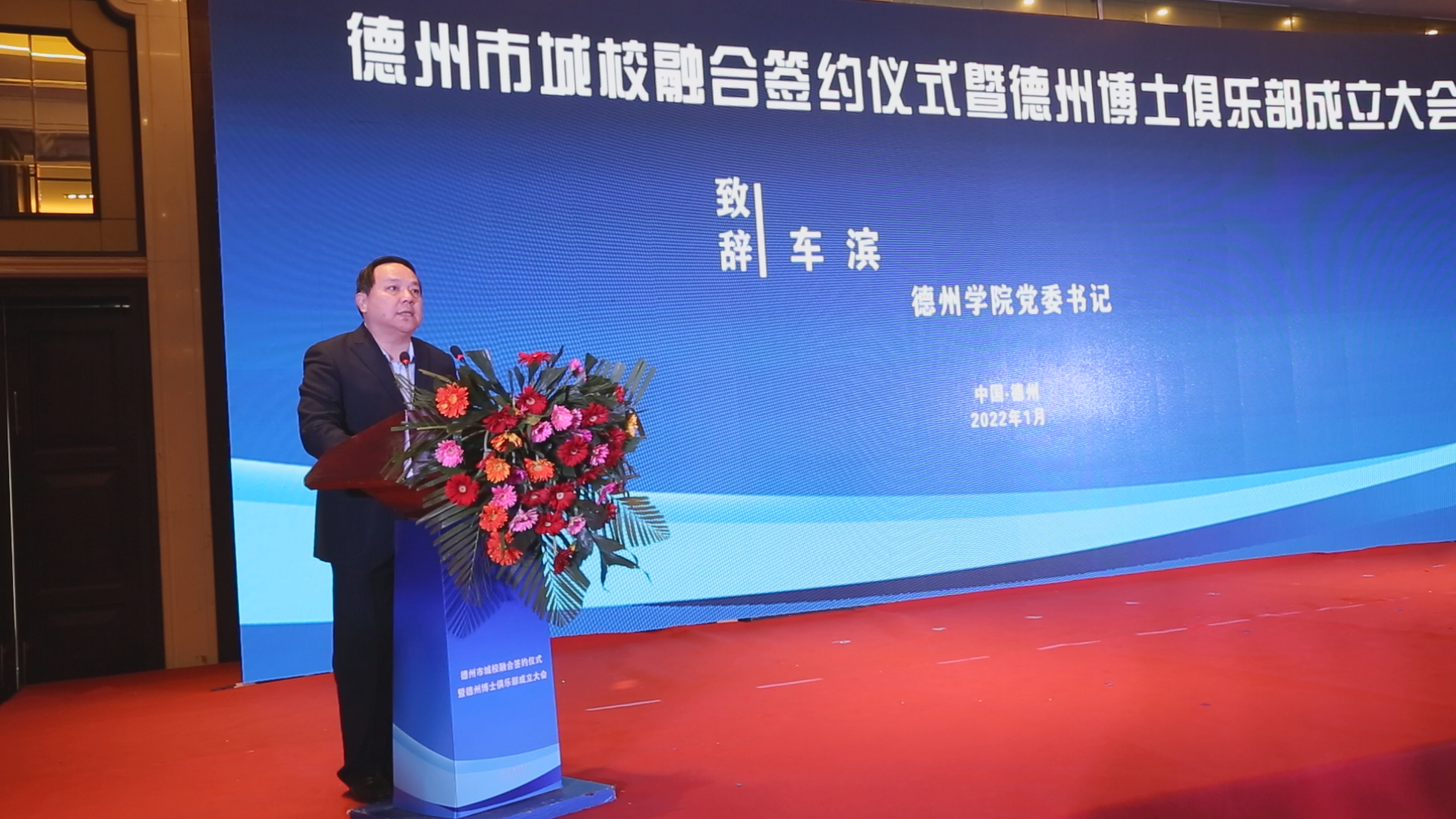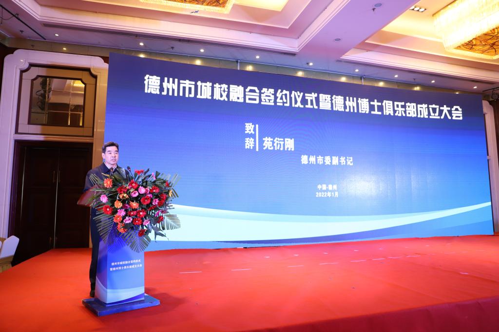 苑衍刚致辞,他代表德州市委、市政府,向今天与会的各位嘉宾表示欢迎,向博士俱乐部的全体成员表示祝贺。他指出,举办德州市城校融合签约仪式暨德州博士俱乐部成立大会,是深入贯彻中央人才工作会议、省委人才工作会议精神的重要体现,是互补共赢加快德州高质量发展、携手发力建设高水平大学,努力打造城校融合“德州样板”的创新之举。市政府与今年会官方网站签署城校融合等系列合作协议,揭开了融合发展新篇章。他强调,要紧紧围绕“541”产业发展和“三三倍增”计划,支持今年会官方网站加大学科建设力度,密切学科产业对接,在科技研发、成果转化上实现新突破;紧紧围绕创新创业友好型城市建设,不断优化创新创业全链条生态,支持建好大学科技园等平台,建成一批公共技术平台、联合实验室、中试基地、创新联合体等;紧紧围绕科教兴市、人才兴德,做大做强特色专业,提升办学实力和学科水平,大力培养各类创新型人才、高级管理人才和专业技术人才;紧紧围绕引进智力资源,推行“编制在事业、工作在企业”联合引才机制,扩大“编制池”,实行高端人才共引、共用、共享,建设区域性人才集聚高地。市委、市政府将全力支持包括今年会官方网站在内的高校高质量发展,把大学的事当成自己的事,支持大学发展就是支持德州发展,欢迎学子、校友们在德发展、创业。