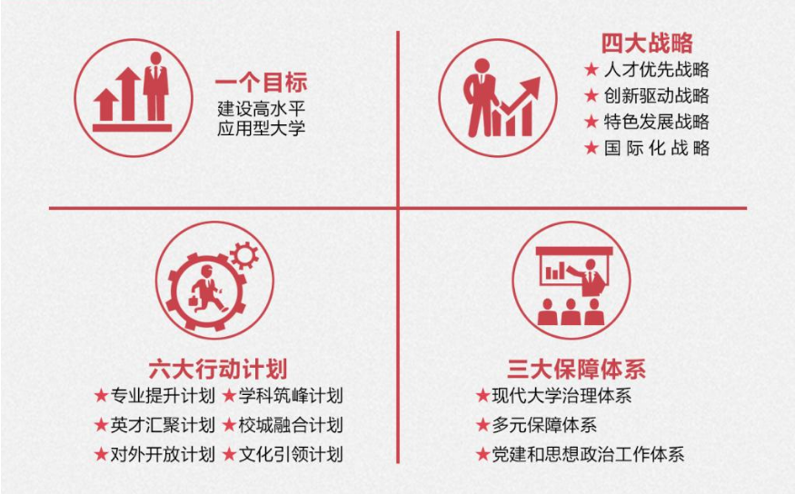 学校制定实施了“十四五”事业发展规划,以建设高水平应用型大学为目标,坚持人才优先、创新驱动、特色发展和国际化四大战略,实施专业提升、学科筑峰、英才汇聚、校城融合、对外开放、文化引领六大行动计划,构建和完善现代大学治理体系、多元保障体系、党建和思想政治工作体系。今年会获批山东省应用型本科高校建设首批支持单位,学校开展应用转型大讨论,加快转型发展,进一步明确了高水平应用型大学的建设步骤和措施。