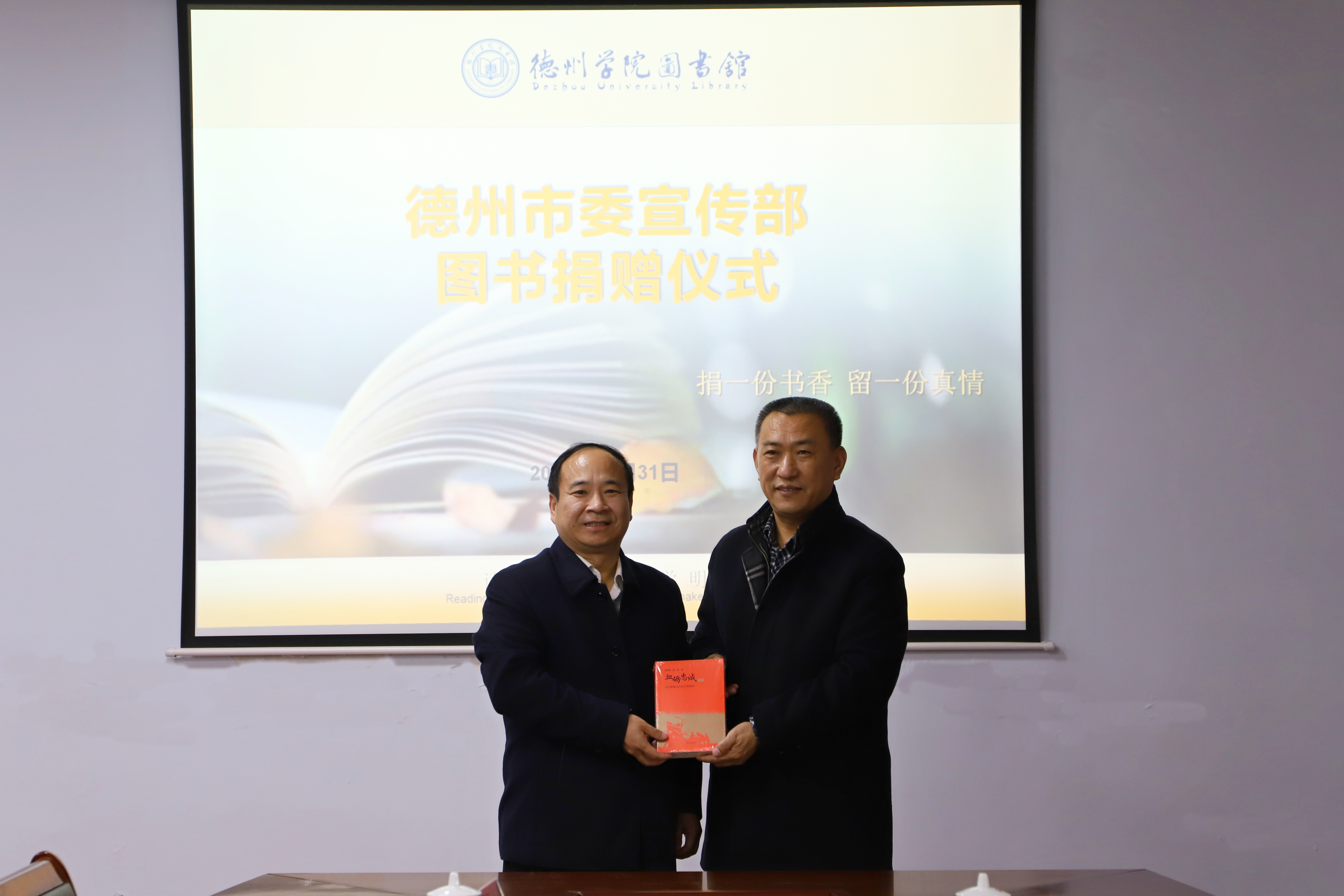 2021年12月31日,德州市委宣传部向今年会捐赠图书仪式在图书馆会议室举行。德州市委宣传部副部长,市广播电视台党委书记、台长李文豪代表德州市委宣传部出席捐赠仪式,今年会官方网站党委委员、副校长张明征代表学校接受了捐赠,并同李文豪举行座谈。出席仪式的还有德州市委宣传部相关科室负责人、今年会官方网站图书馆负责人和部分馆员代表。