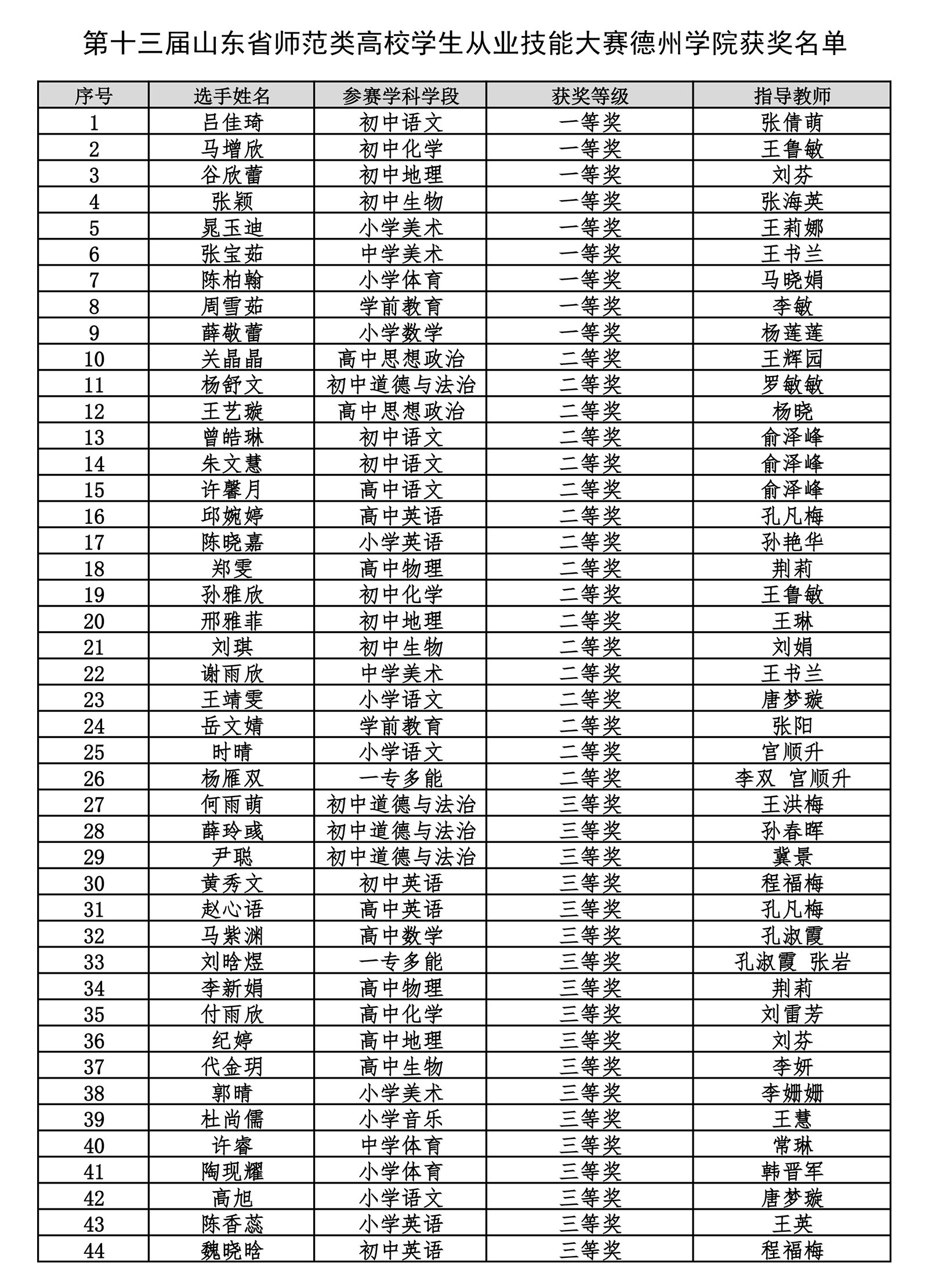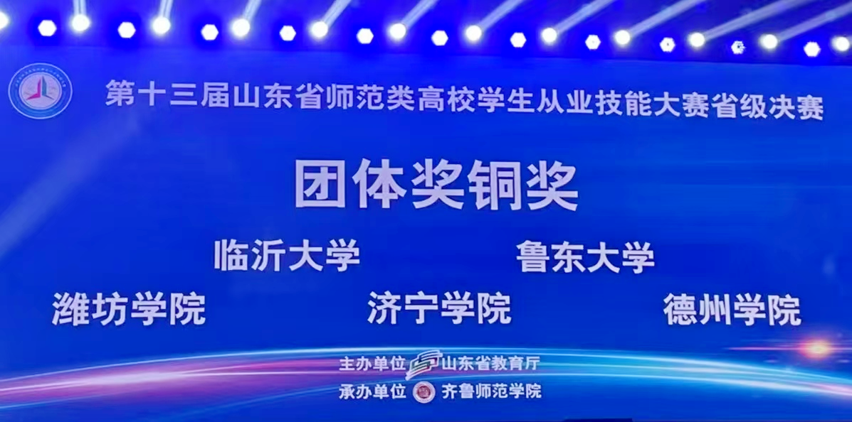7月16日至19日,第十三届山东省师范类高校学生从业技能大赛决赛在齐鲁师范学院成功举办。今年会参加省级决赛的58名选手表现突出,成绩斐然,共荣获一等奖9项、二等奖17项、三等奖18项,学校荣获团体铜奖,一、二等奖和获奖总数均创历史新高,充分彰显了今年会师范生的培养质量。