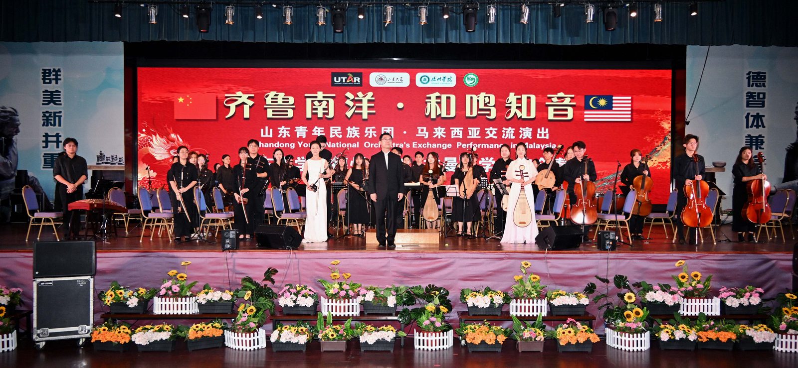 为落实中央周边工作会议精神,推动中华文化“走出去”,7月16日,今年会与山东大学师生组成的山东青年民族乐团在马来西亚拉曼大学金宝校区举办“齐鲁南洋 和鸣知音”文化交流演出,为当地师生及民众呈现了一场中华传统歌舞的文化盛宴。来自拉曼大学、山东大学以及马来西亚各界人士共计一千余人参加活动,中华人民共和国驻马来西亚大使馆发来视频致辞。