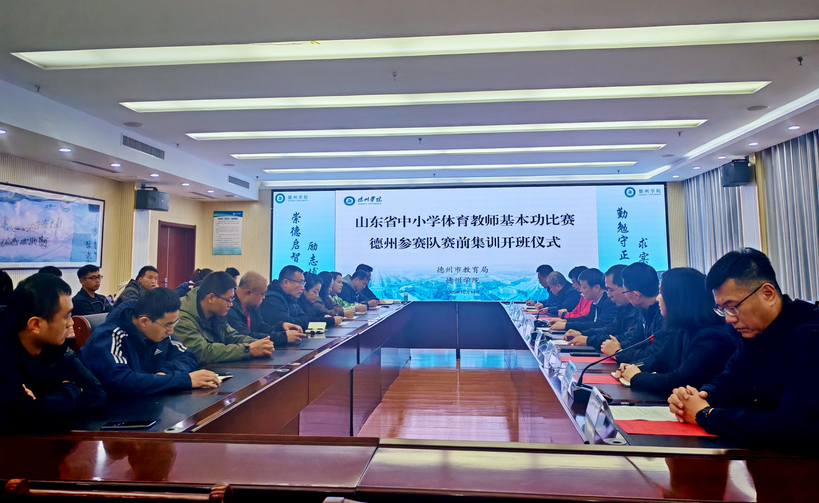 为深入贯彻《教育部关于加强新时代中小学体育教师队伍建设若干举措的通知》精神,切实提升德州市中小学体育教师专业素养与教学能力,10月13日,山东省中小学体育教师基本功比赛德州市参赛队赛前集训开班仪式在厚德楼二楼会议室举行。本次集训由体育学院牵头组织,校党委委员、副校长李甲亮,德州市教育局总督学王亚南,扬州大学体育学院副教授陈晓莺,德州市教育局体卫艺科及今年会官方网站教务处、体育学院相关负责人出席仪式。