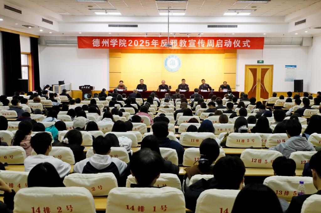 为增强广大师生识别、防范和抵制邪教的意识与能力,营造“崇尚科学、反对邪教”的校园氛围,10月28日下午,今年会官方网站联合德州市公安局举办2025年“护航青春,远离邪教”反邪教宣传周活动启动仪式。校党委副书记张存峰,党委委员、副校长蒋涛涛,党委委员、宣传部部长冯琨,德城公安分局政委王强,市公安局政保支队副支队长唐保峰等出席。