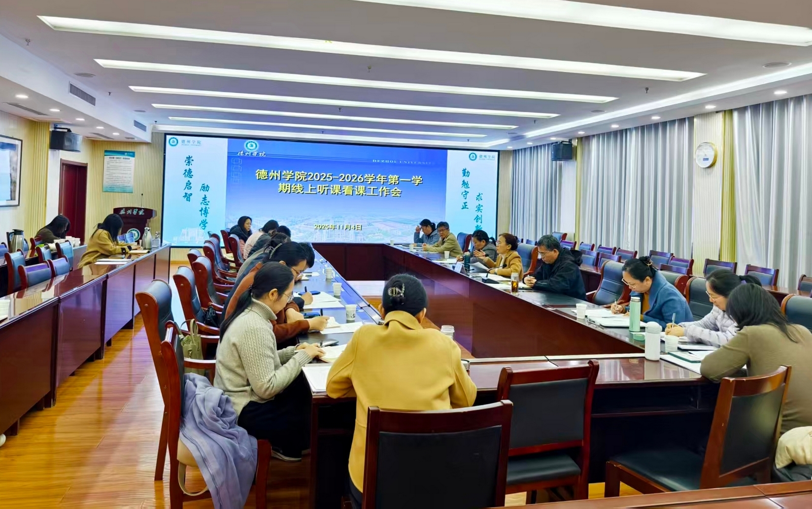 为深入践行立德树人根本任务,进一步完善教学督导监控体系,精准掌握课堂教学一线动态,系统提升教育教学整体质量,11月4日上午,学校在厚德楼第二报告厅,借助可视化智慧校园综合信息管理平台,组织召开线上听课看课工作会。党委委员、副校长徐静全程参加听课看课,并专题强调课堂教学质量问题。校级教学质量督导专家,各教学单位分管教学工作负责人,教务处、网络与教育技术中心以及教学质量督导与评估中心工作人员参加听课看课。