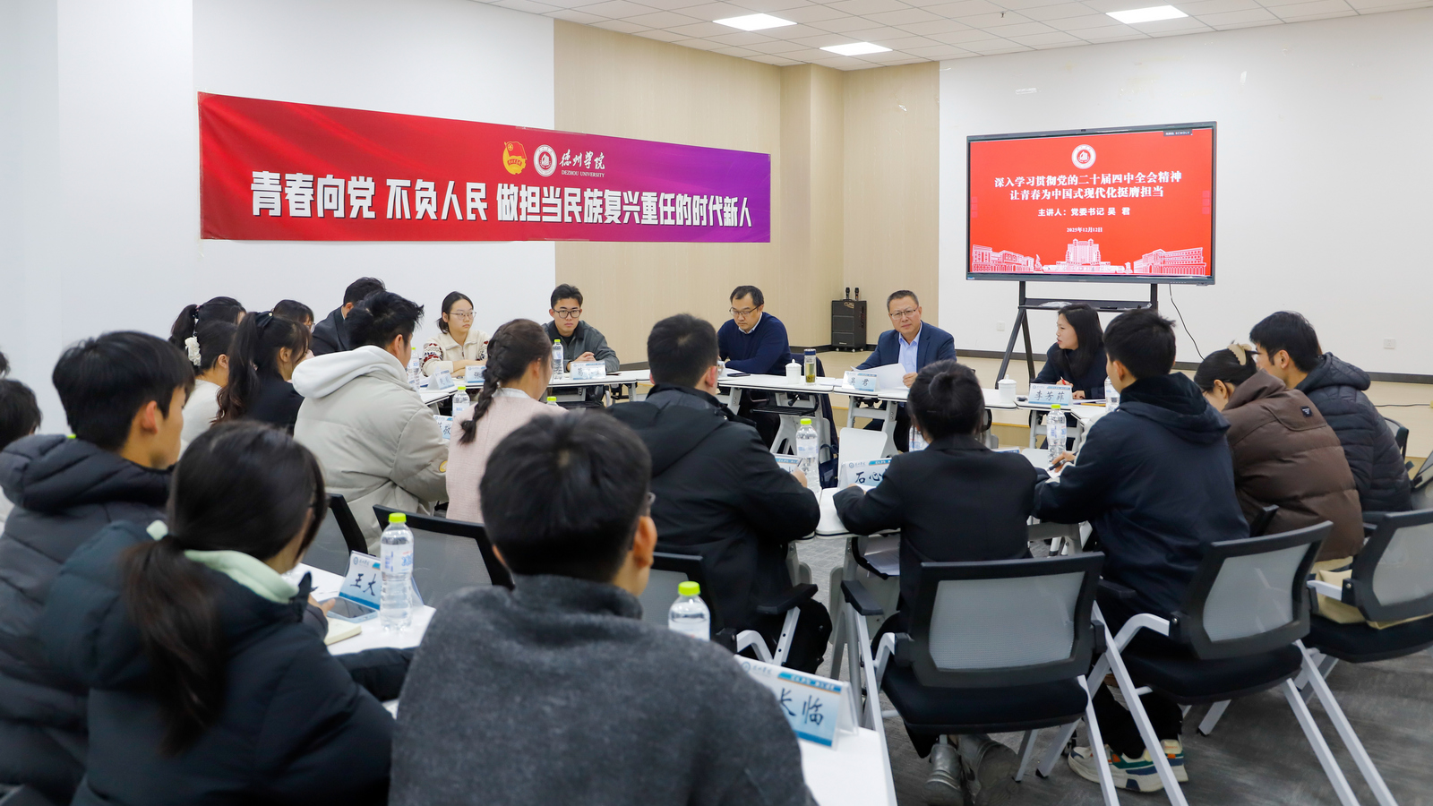 12月12日,山东高校宣讲团成员、校党委书记吴君以《深入学习贯彻党的二十届四中全会精神 让青春为中国式现代化挺膺担当》为题,为学校“青马班”学员、学生代表讲授思政课。
