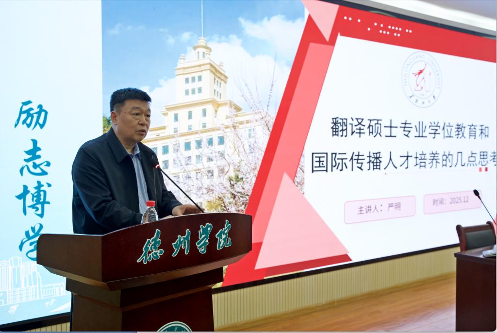 大会第二阶段,严明教授以“翻译硕士专业学位教育和国际传播人才培养的几点思考”为题作专题报告。他围绕新时代外语专业面临的机遇与挑战,深刻阐释了“翻译+国际传播”复合型人才的培养逻辑,为产业学院课程体系优化与育人模式创新提供了前沿指导。