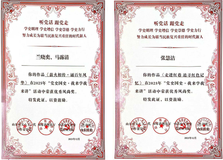 近日,由山东省关心下一代工作委员会、省教育厅、省委党史研究院、团省委联合主办,山东教育电视台承办的2025年“党史国史·我来学我来讲”活动评审结果揭晓。校关工委选送的《薪火相传·诵百年风华》与《走进红巷,追寻红色记忆》两部作品荣获“优秀风尚奖”。