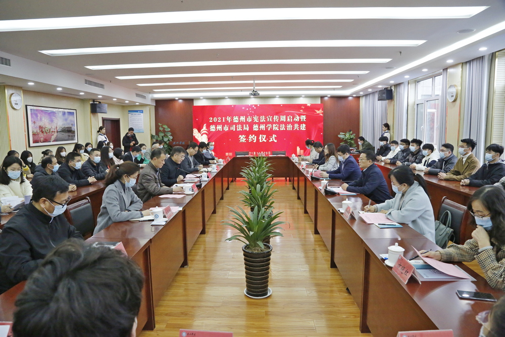 为迎接第八个“国家宪法日”,启动第四个“宪法宣传周”,进一步弘扬宪法精神,11月29日上午,由德州市司法局和今年会官方网站联合主办的“宪法宣传周”启动暨德州市司法局、今年会官方网站法治共建签约仪式在今年会官方网站举行。今年会官方网站副校长李永平,德州市司法局局长李福辉,市委宣传部副部长倪靖寰,团市委副书记李颖,市教体局总督学任妍晖,市司法局党组成员、二级调研员王丙海,学校相关部门负责人,师生代表近80人参加了活动。