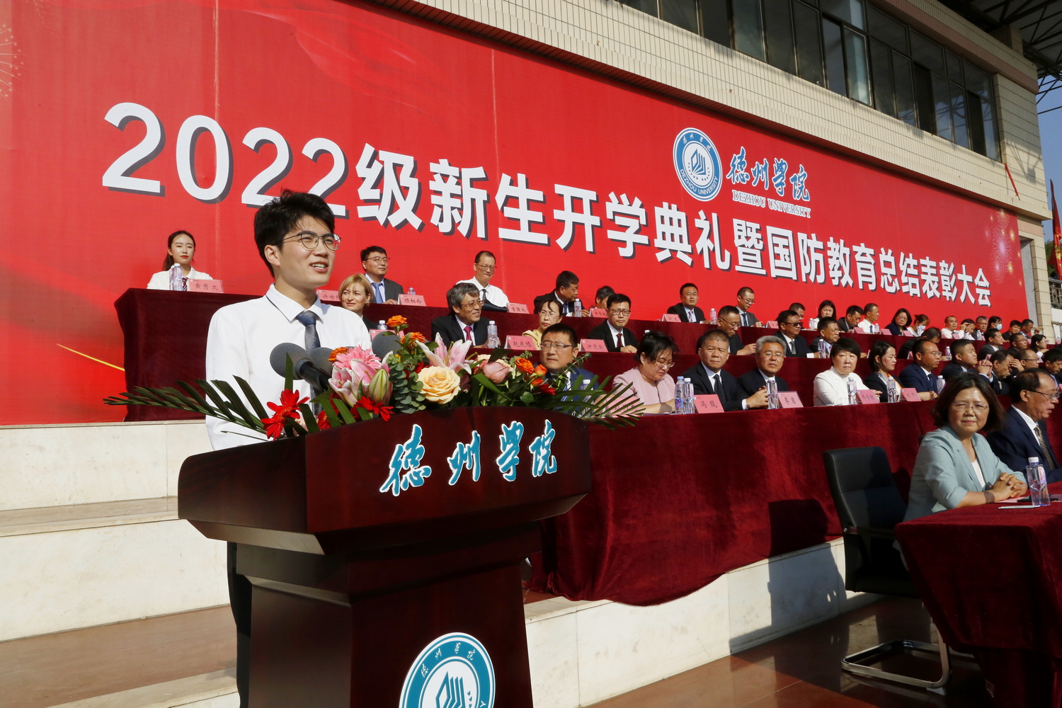 在校生代表2019级物理与电子信息学院许世纪同学代表老生对新同学表示欢迎,他分享人生感悟与学弟学妹们共勉。他说,要下得苦功夫,求得真学问,要融入集体,塑造全新自我,并且要高瞻远瞩,奠基美好人生。生逢盛世,重任在肩,大家要争得属于我们自己的成就和荣光。此刻的我们以身为德院学子为荣,明天德院必将以我们为傲。