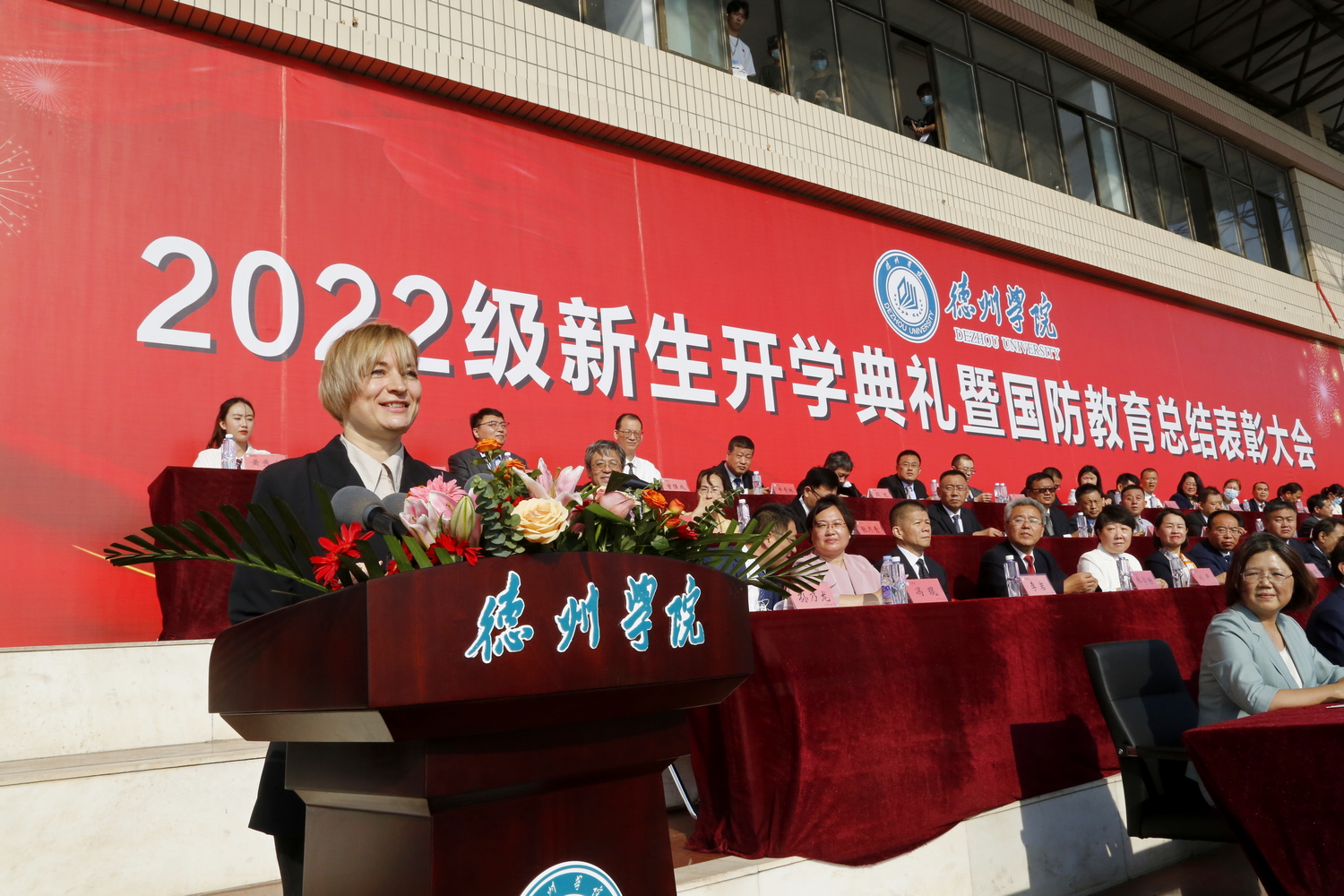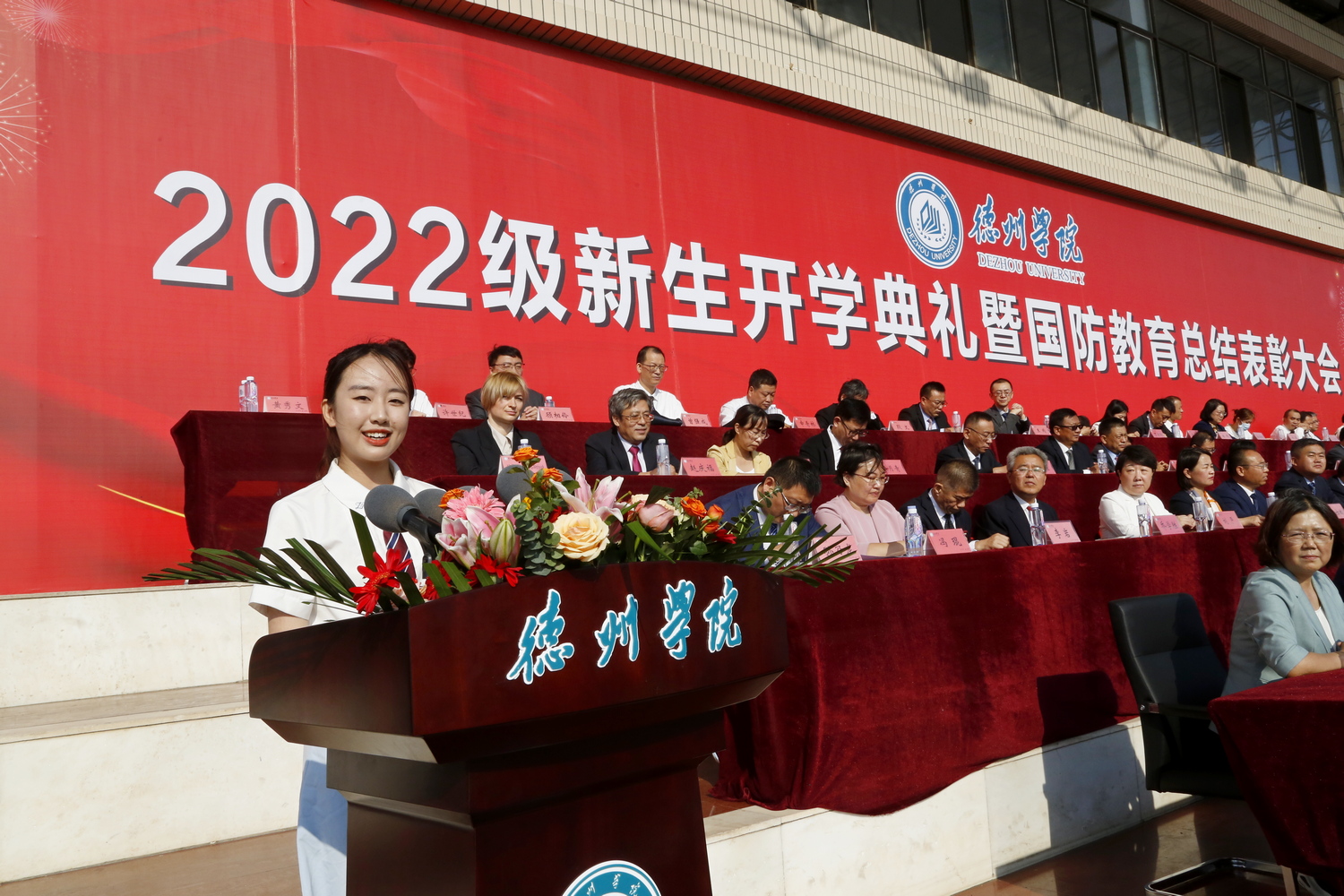 新生代表外国语学院黄秀文同学分享了德院初印象。她说,短短的十几天,我勾画出我心目中德院的模样,她是我理想中的样子,是我全新的开始。她表示,将会尽快融入大学生活,树立远大目标,严于律己,严格遵守学校的各项规章制度,培养规范意识,提高自律能力,秉承着“崇德、启智、励志、博学”的校训,与祖国、与学校同频共振、同向而行,在为国家事业奉献青春中,实现自己的人生价值。