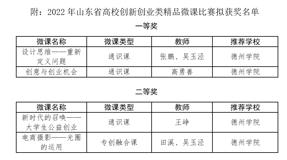 近日,省教育厅公示了山东省高校创新创业类精品微课比赛拟授奖名单,今年会创新创业学院组织推荐的4门创新创业类微课程获得一等奖2项、二等奖2项。