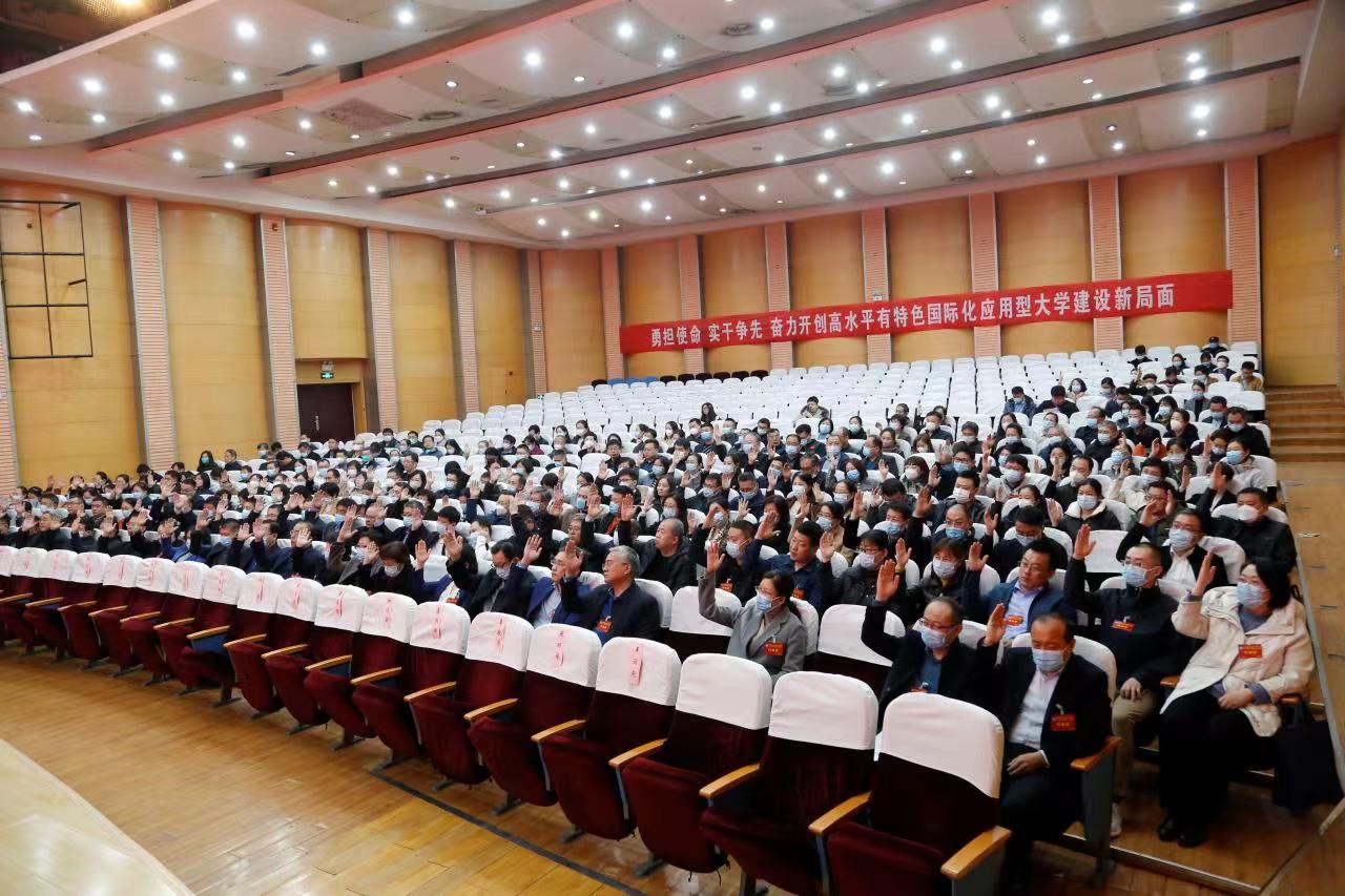 赵长林向大会作了题为《勇担使命 实干争先奋力开创高水平有特色国际化应用型大学建设新局面》的工作报告。报告聚焦学校发展关键和攻坚目标,总结了过去一年工作,深入分析了当前面临的机遇和挑战,明确了今后三年的总体目标,部署了2023年的重点任务。