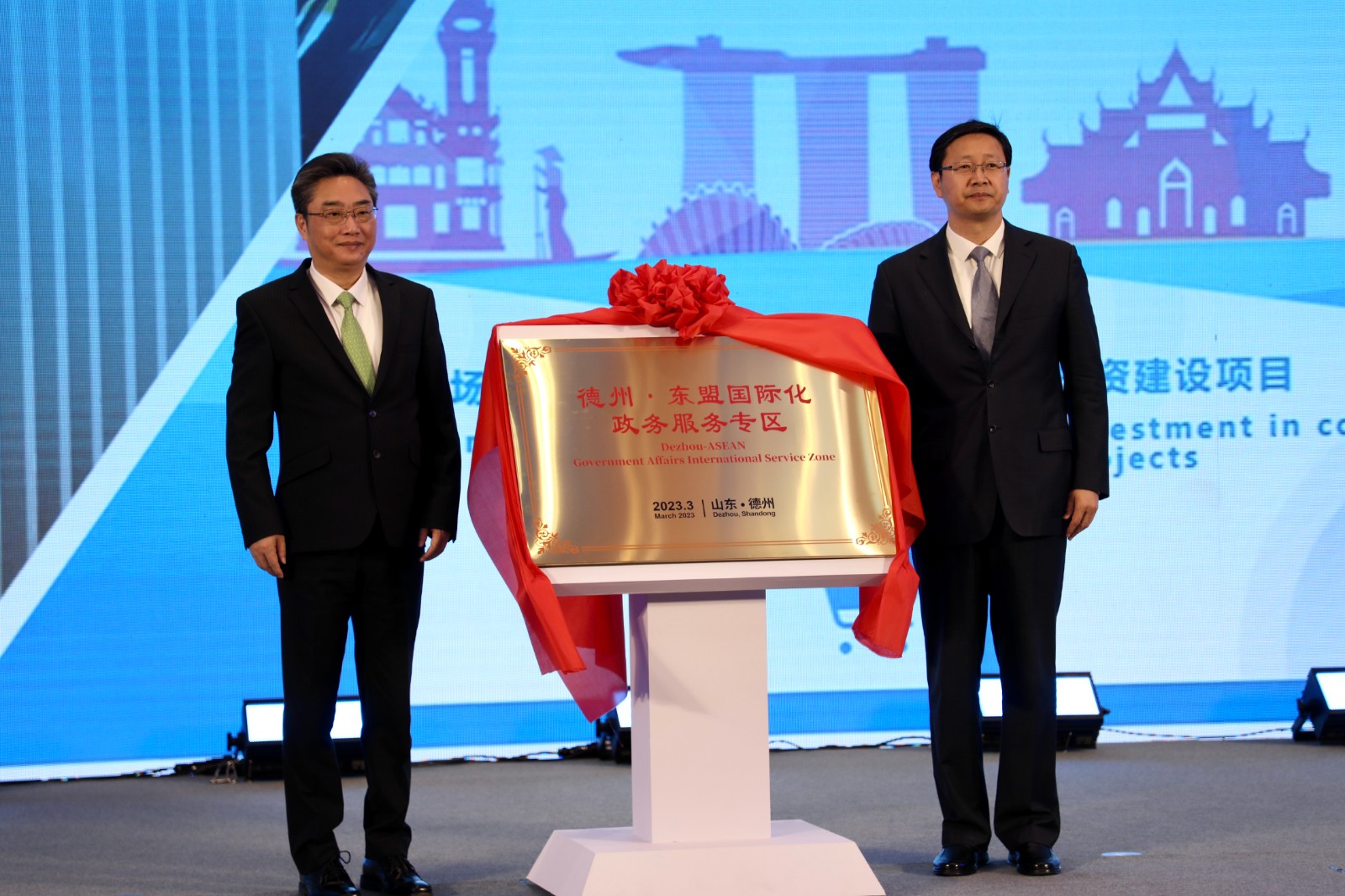 史忠俊、宿胜为“德州·东盟国际化政务服务专区”揭牌。