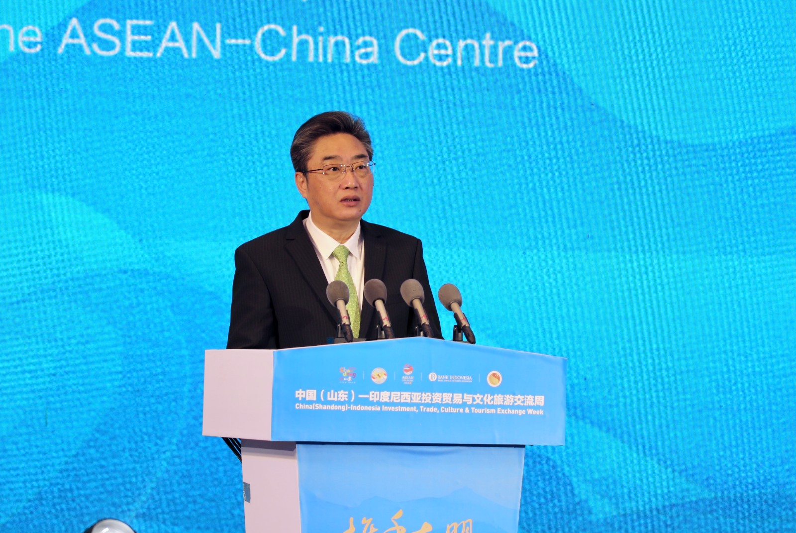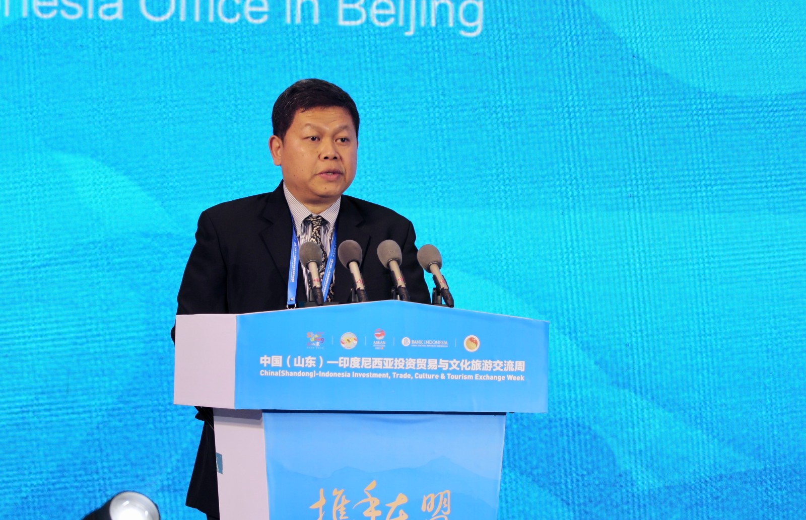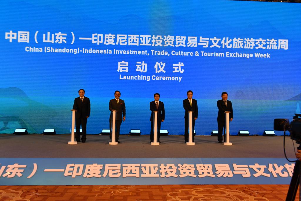 嘉宾致辞结束后,邓云锋、周浩黎、史忠俊、朱开国和图图克·卡育侬共同启动“中国(山东)—印度尼西亚投资贸易与文化旅游交流周”。