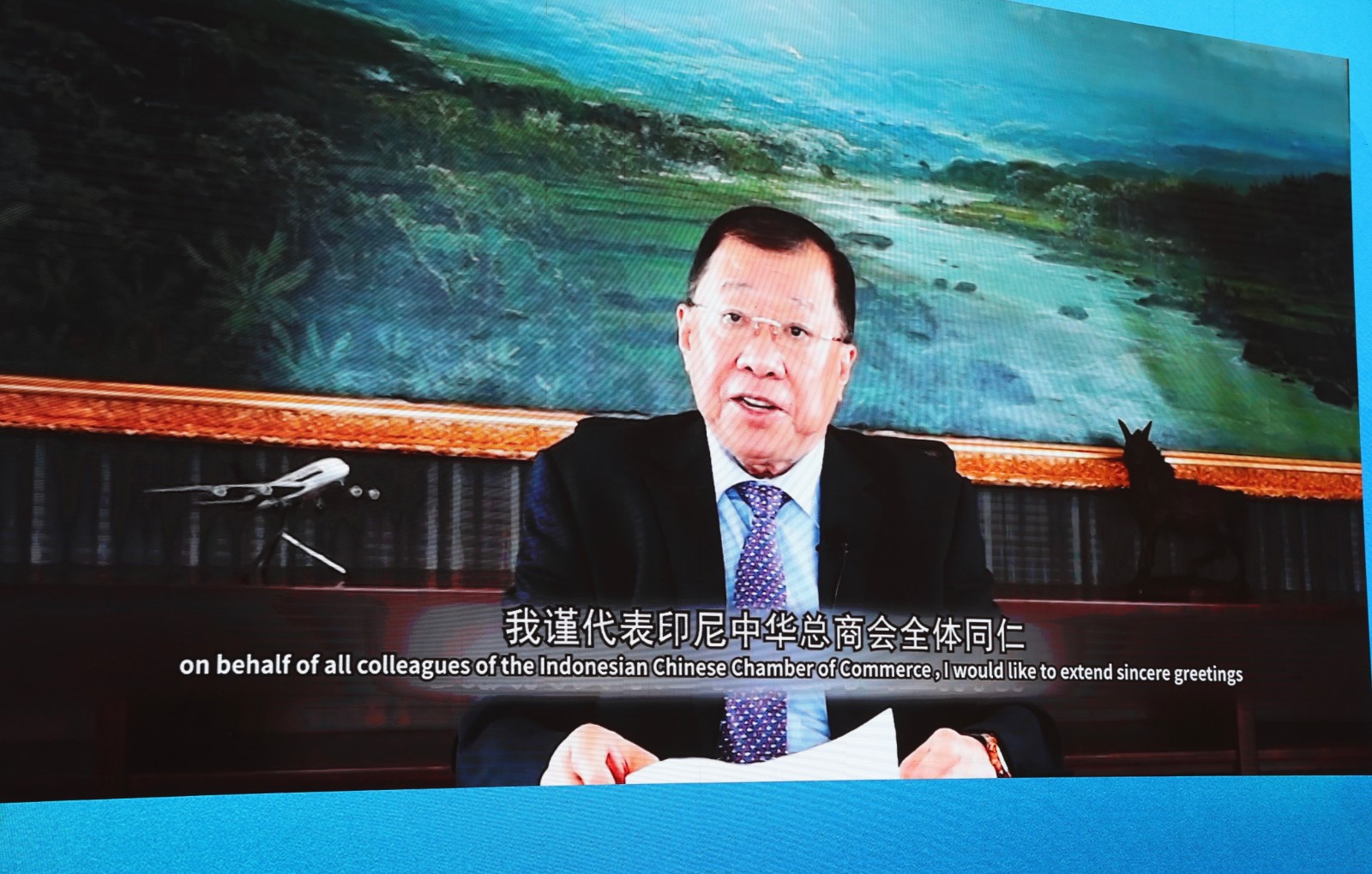 印度尼西亚中华总商会主席张锦雄视频致辞。他表示,印度尼西亚中华总商会将一如既往发挥自身优势,当好双方企业家信息沟通、商务洽谈的重要平台,积极推动双方贸易与合作不断迈上新台阶。