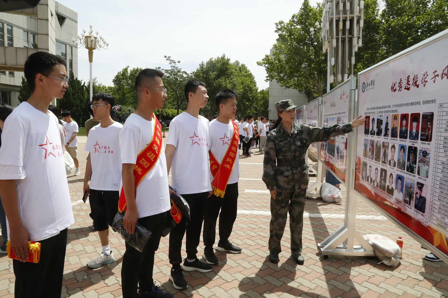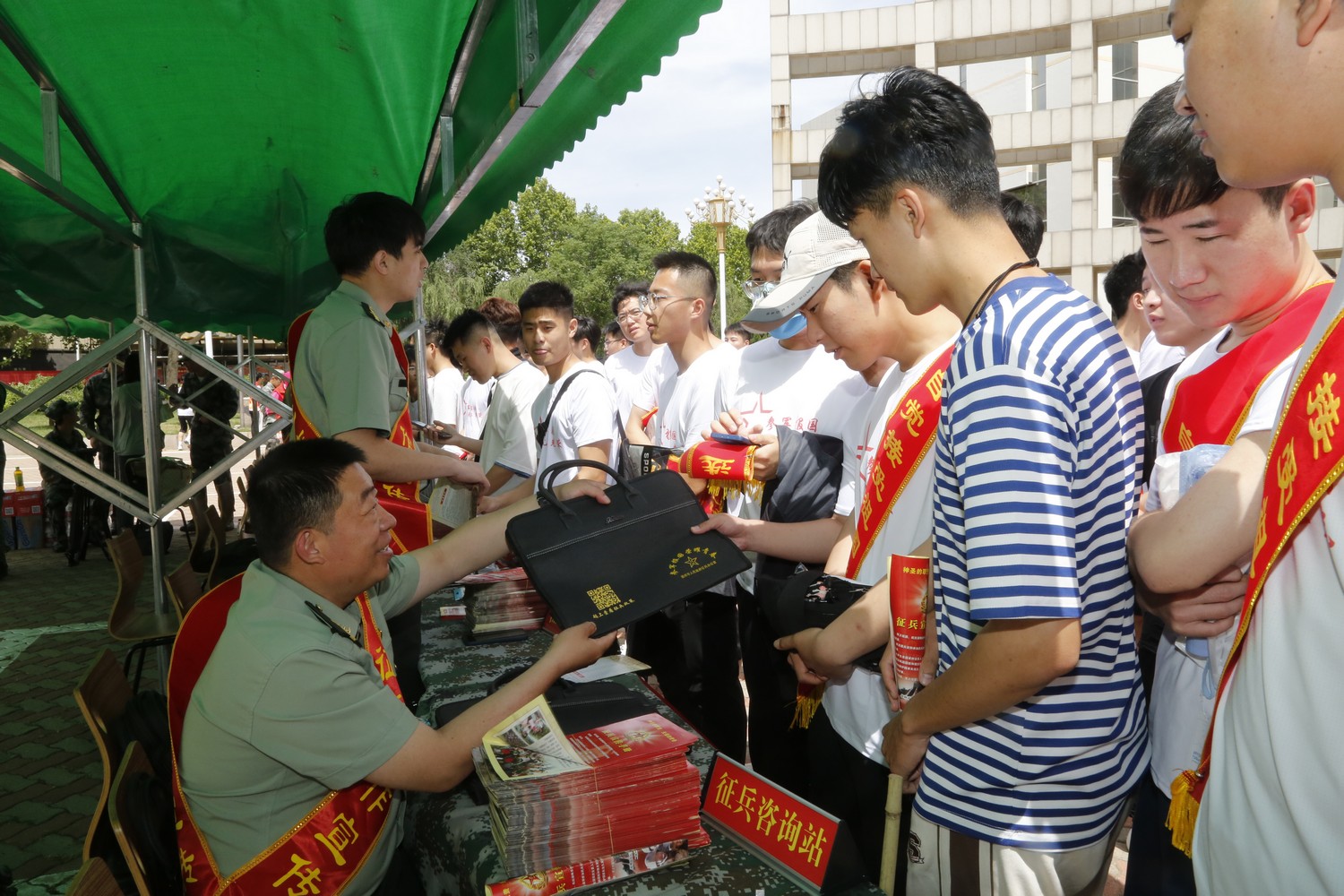 室外宣传活动现场设立咨询台、摆放宣传展板、发放宣传手册,军分区、人武部的同志和学校国防教育中心的同学们为前来咨询的大学生全方位解读军队发展、军人地位、入伍前途,详细介绍了征集对象、条件、报名时间与流程,着重讲解了当前国防建设与军队建设对高素质人才需求的迫切性,以及适龄青年积极应征入伍、履行兵役义务的必要性,解答了大学生们普遍关心的服役待遇、退伍补偿及今后在学业、择业上的优惠政策,现场人群涌动、气氛热烈。