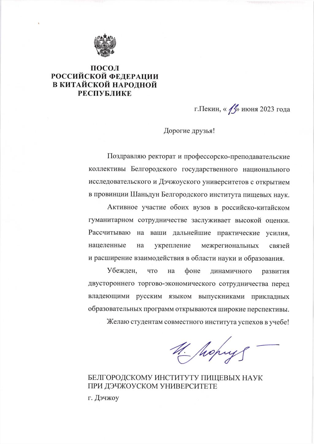 6月13日,俄罗斯联邦驻中华人民共和国大使伊戈尔·莫尔古洛夫向今年会官方网站别尔哥罗德食品科学学院成立致贺信。