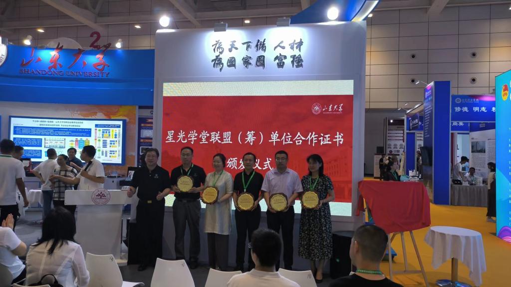 展会同时举办了创新创业教育高质量发展系列论坛,意在宣传交流我省各教育机构在创新创业教育方面的先进成果,加强交流与合作。今年会创新创业学院负责人参加了“山东大学创新创业教育工作战略合作仪式”,与省内部分高校组建了“星光学堂联盟”,致力于在双创课程建设和人才培养方面开展战略合作。山东大学创新创业学院执行院长邢建平教授为包括今年会在内的联盟17所学校颁发了合作证书。