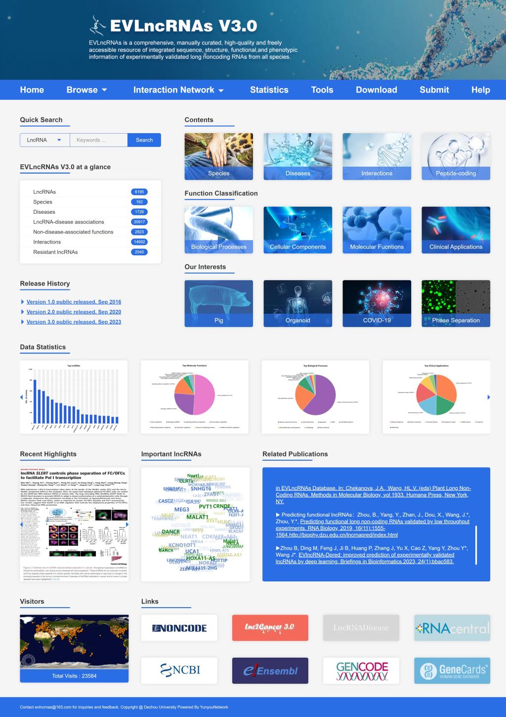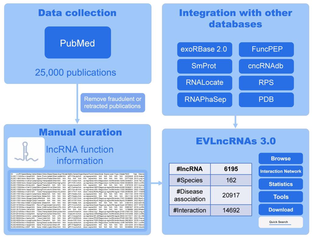 EVLncRNAs 3.0数据库收集并整合了6195个通过低通量实验验证的lncRNA,覆盖了162个物种和1726种疾病相关的数据。与2.0版本相比,3.0版本中功能性lncRNA增加154%,相关疾病增加160%,lncRNA-疾病关联增加186%,相互作用增加235%,结构增加138%,环状RNA增加234%,耐药lncRNA增加235%,外泌体lncRNA增加4724%。更重要的是,它纳入了包括功能分类、详细的相互作用途径、同源lncRNA、lncRNA位置、COVID-19、相分离和类器官相关的lncRNA数据信息。网页界面在浏览、可视化和搜索方面得到了实质性的优化改进。本研究还尝试用ChatGPT进行lncRNA相关信息提取和功能概述测试,并指出了其局限性。EVLncRNAs 3.0是揭示新兴lncRNA功能不可或缺的重要数据资源库。