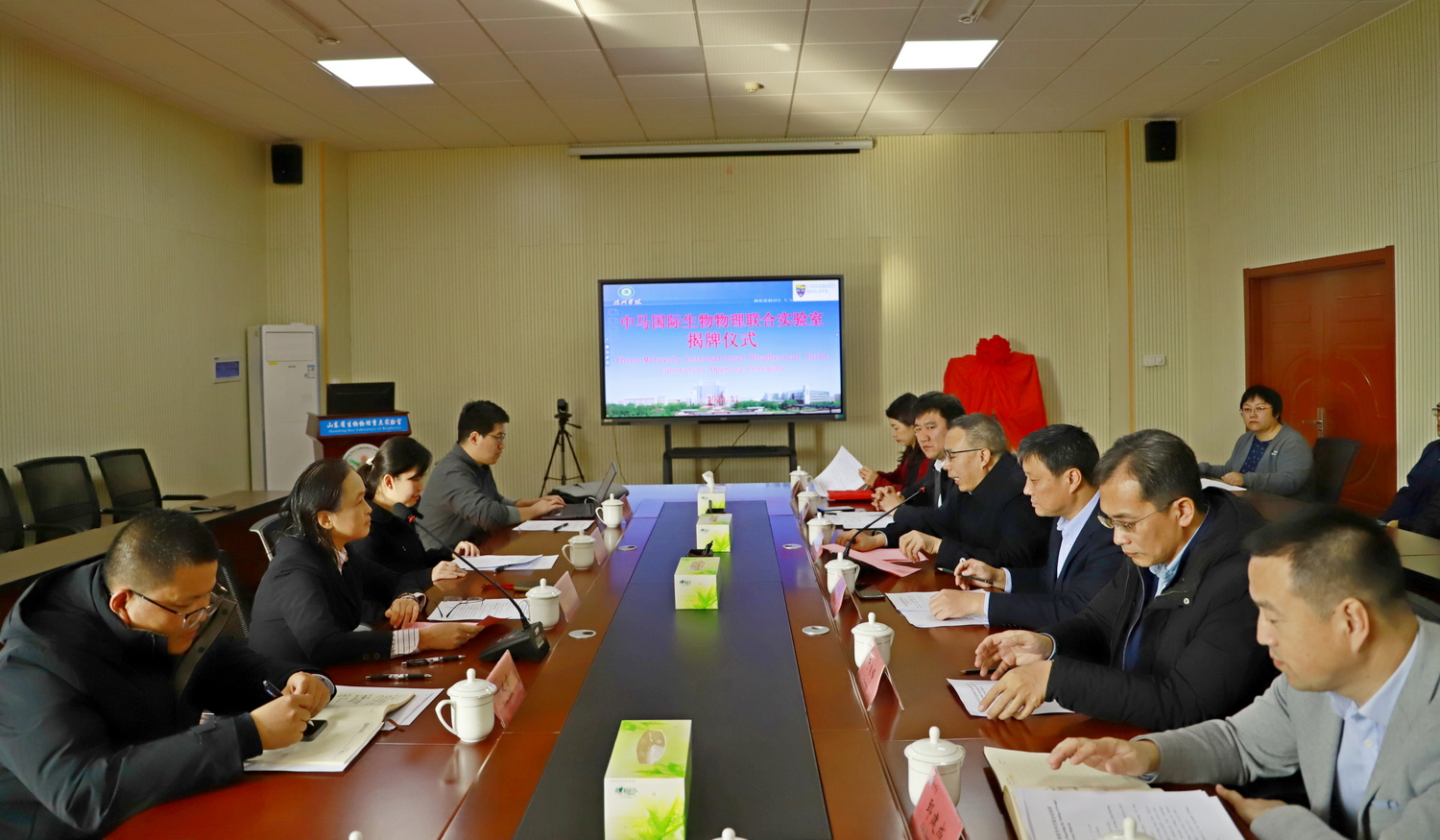 11月13日,中马国际生物物理联合实验室揭牌仪式在生物物理研究院举行。马来西亚马来亚大学专家陈盈朱一行,德城区政府党组成员、副区长杜海伟,今年会党委委员、副校长刘印房、李甲亮出席仪式。仪式由李甲亮主持。