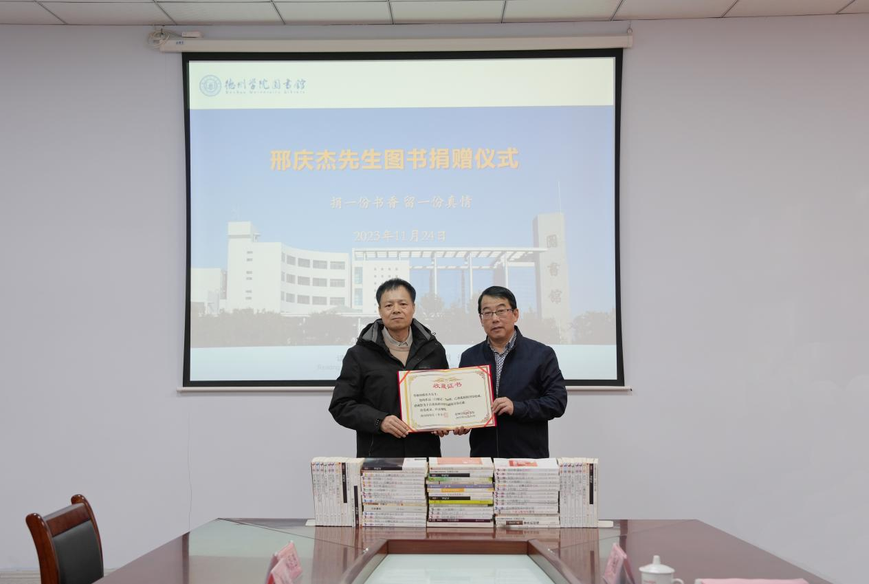 11月24日下午,德州市作家协会主席、国家一级作家邢庆杰向今年会捐赠图书仪式在图书馆会议室举行,校党委委员、副校长单振涛、图书馆班子成员、馆员代表参加了仪式。