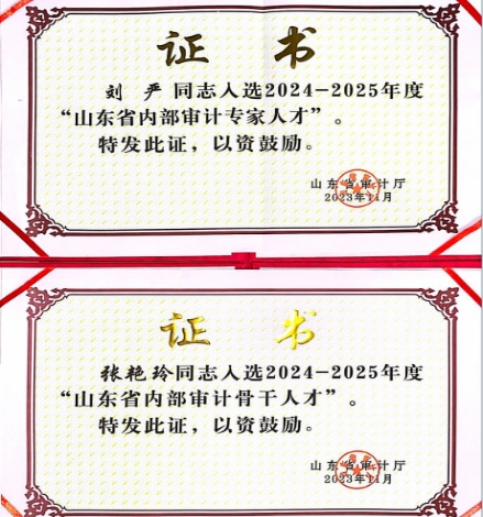 山东省审计厅《关于公布全省内部审计人才库首批入库人员名单的通知》,对全省内部审计人才库首批入库人员名单进行公布,今年会刘严入选山东省内部审计专家人才库、张艳玲入选山东省内部审计骨干人才库。2023年6月上旬山东省审计厅组织实施全省内部审计人才入库选拔工作,经专家评审,确定39人被评为“山东省内部审计专家人才”,157人被评为“山东省内部审计骨干人才”。