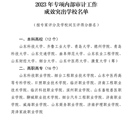 山东省教育厅《关于2023年专项内部审计工作情况的通报》(鲁教财函〔2023〕86号),对2023年省教育厅组织的人才政策落实、招标采购事项专项内部审计工作开展情况进行了通报,并对审计工作成效突出的学校通报表扬,今年会综合评分名列第四名。2023年4月至10月,省教育厅组织开展专项内部审计工作,11月对专项审计成果进行了展示,全省有110所高校参与成果展示活动,有12所本科高校、16所高职高专院校受到省教育厅通报表扬。