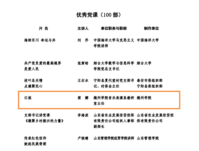 此次获评的山东省优秀党课,是今年会制作的学习贯彻习近平新时代中国特色社会主义思想主题教育情景党课《江姐》,由学校主题教育领导小组办公室主办,音乐学院承办,音乐学院第二教师党支部书记、音乐表演系主任梁娜老师主讲,音乐学院李琛、魏丽老师和学生演出,以民族歌剧《江姐》为载体,以导赏+演出的方式进行,通过生动演讲与多媒体、歌剧表演的结合,情景再现了革命烈士江竹筠的光荣事迹,展现了共产党人坚如磐石的理想信念、和衷共济的爱国情怀、艰苦卓绝的凛然斗志和百折不挠的浩然正气。