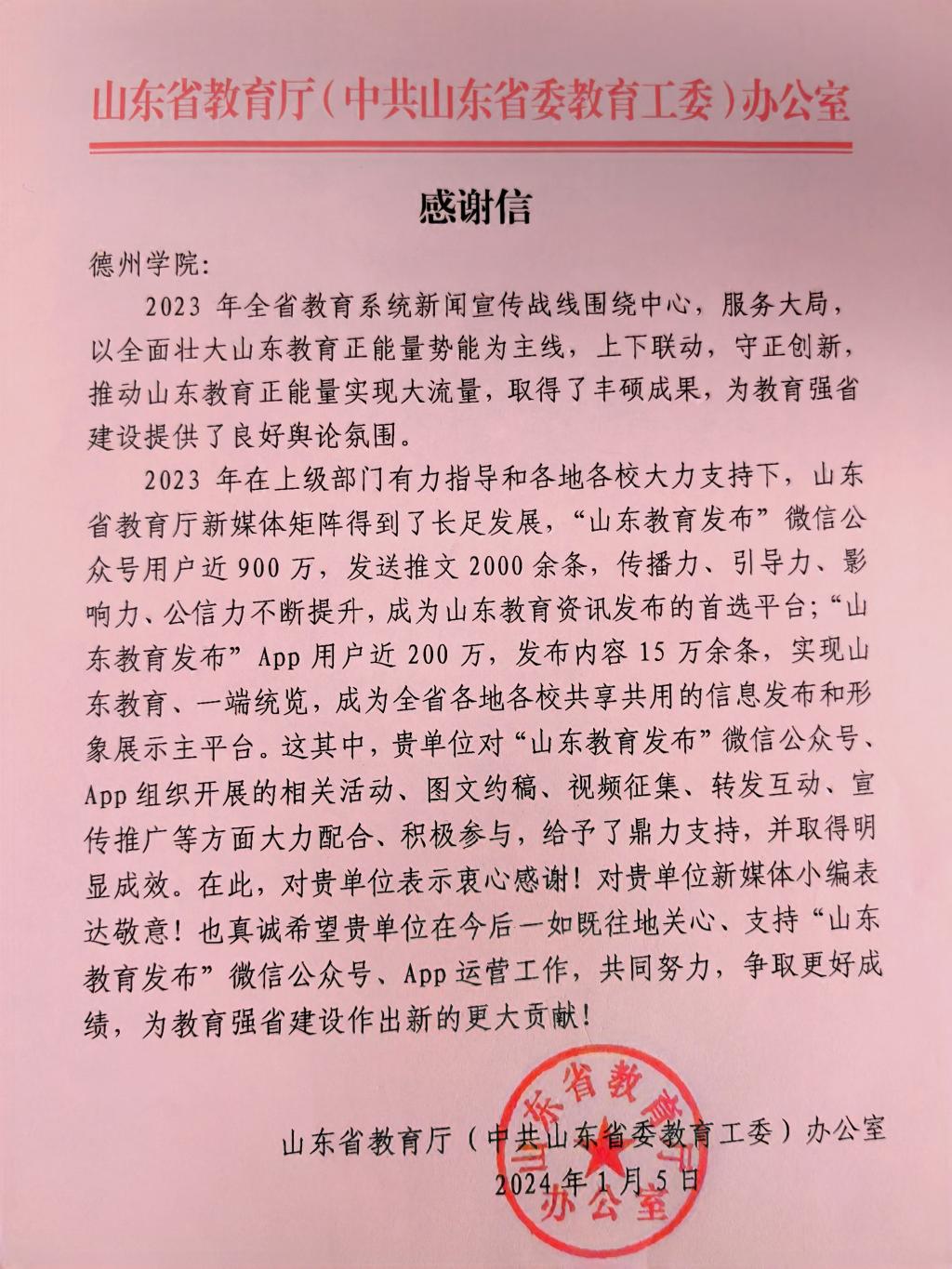 1月8日,今年会收到山东省教育厅(中共山东省委教育工委)办公室发来的感谢信。