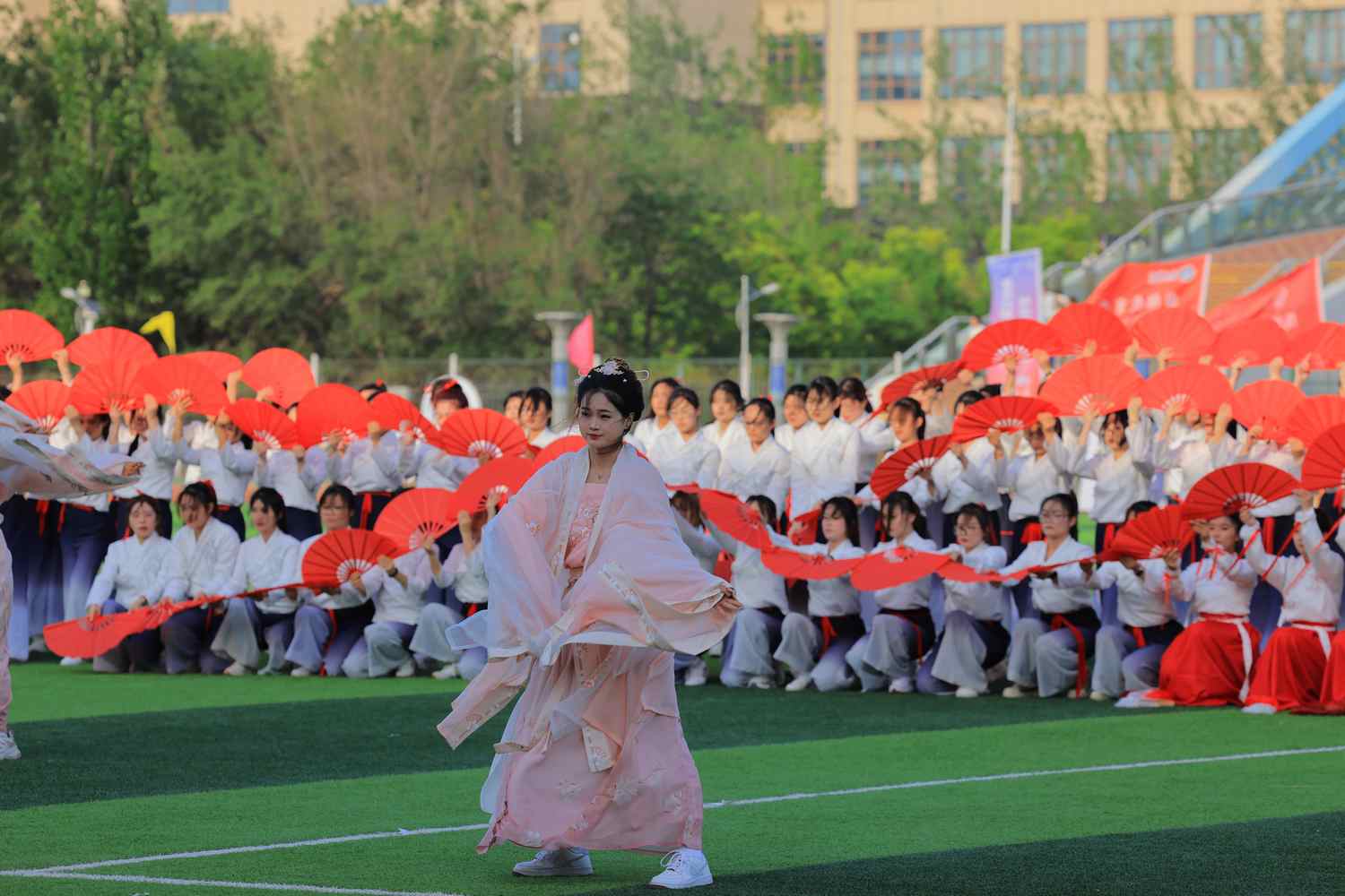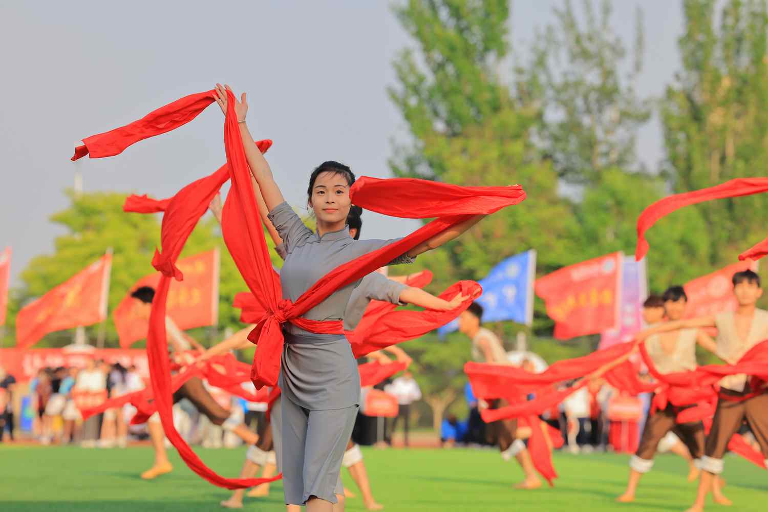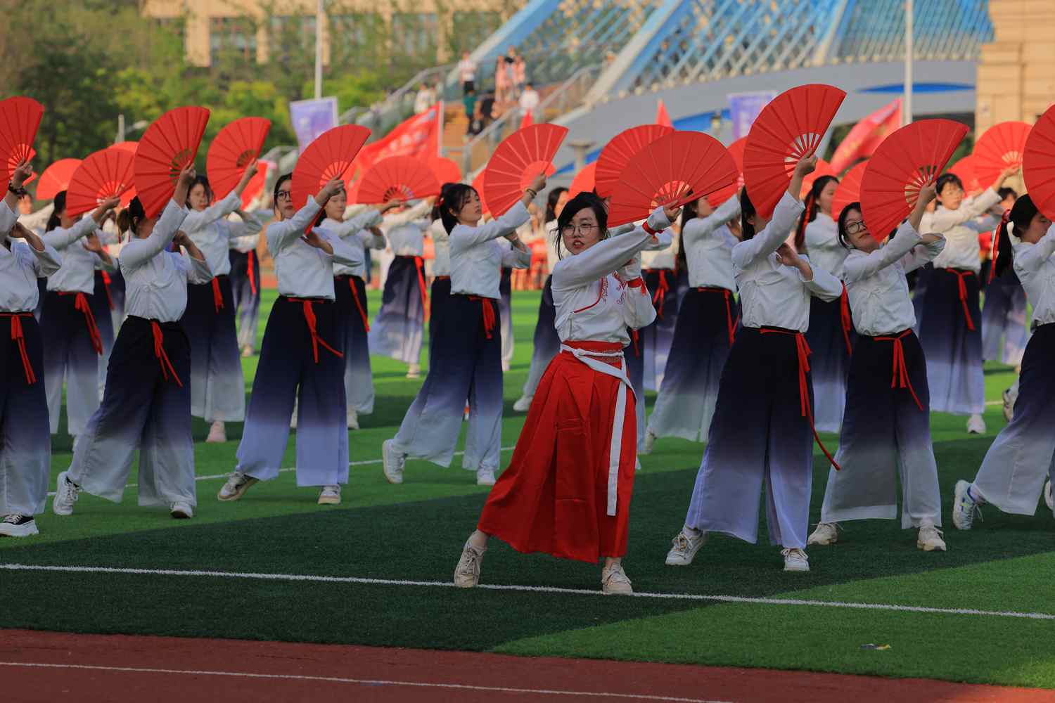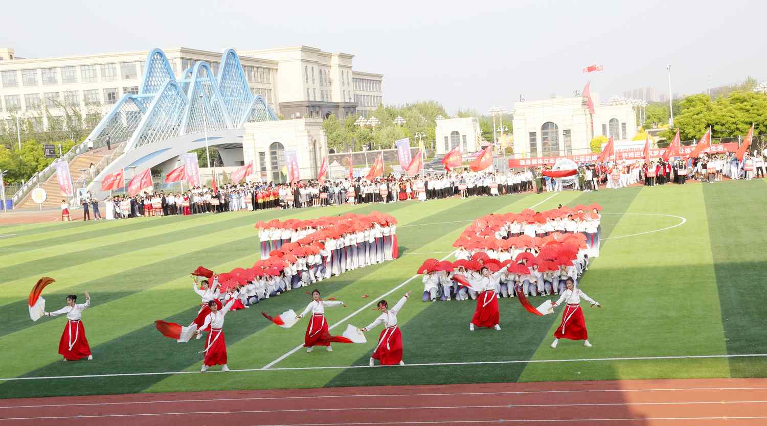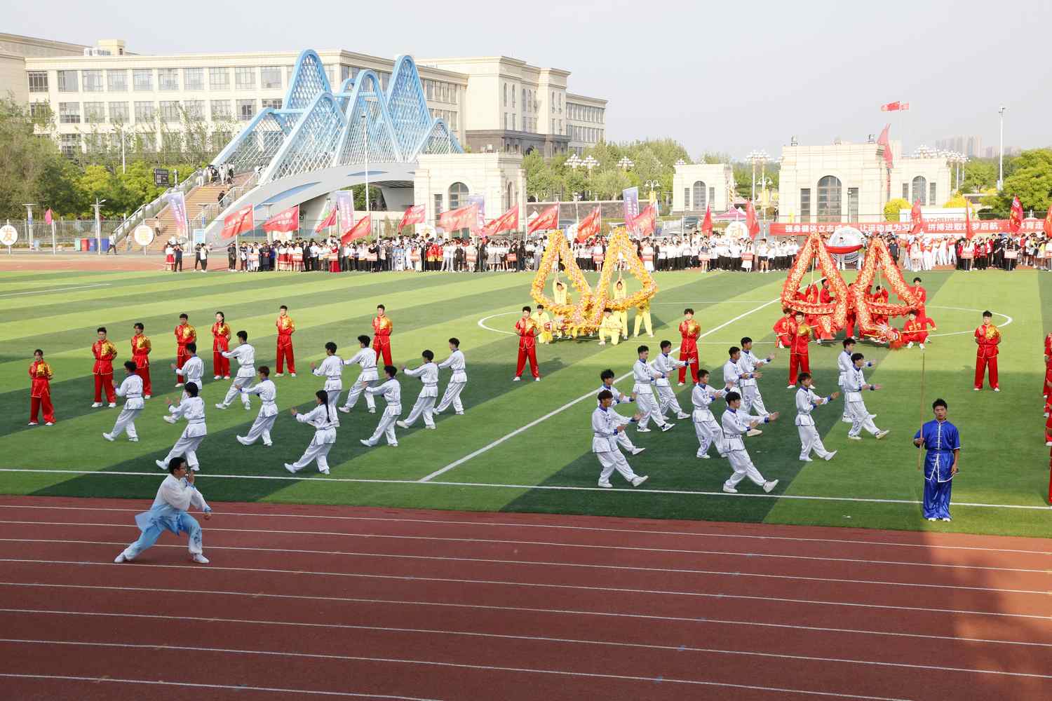 在闭幕式节目表演环节,音乐学院带来的舞蹈《保卫黄河》震撼开场,拉开了闭幕式的序幕;纺织服装学院、生态与资源环境学院、化学化工学院带来的国风扇子舞《骁》诠释了中华优秀传统文化的底蕴;《盛世中华》以中国非物质文化遗产舞龙舞狮上演,表现了对美好生活的热爱与追求。