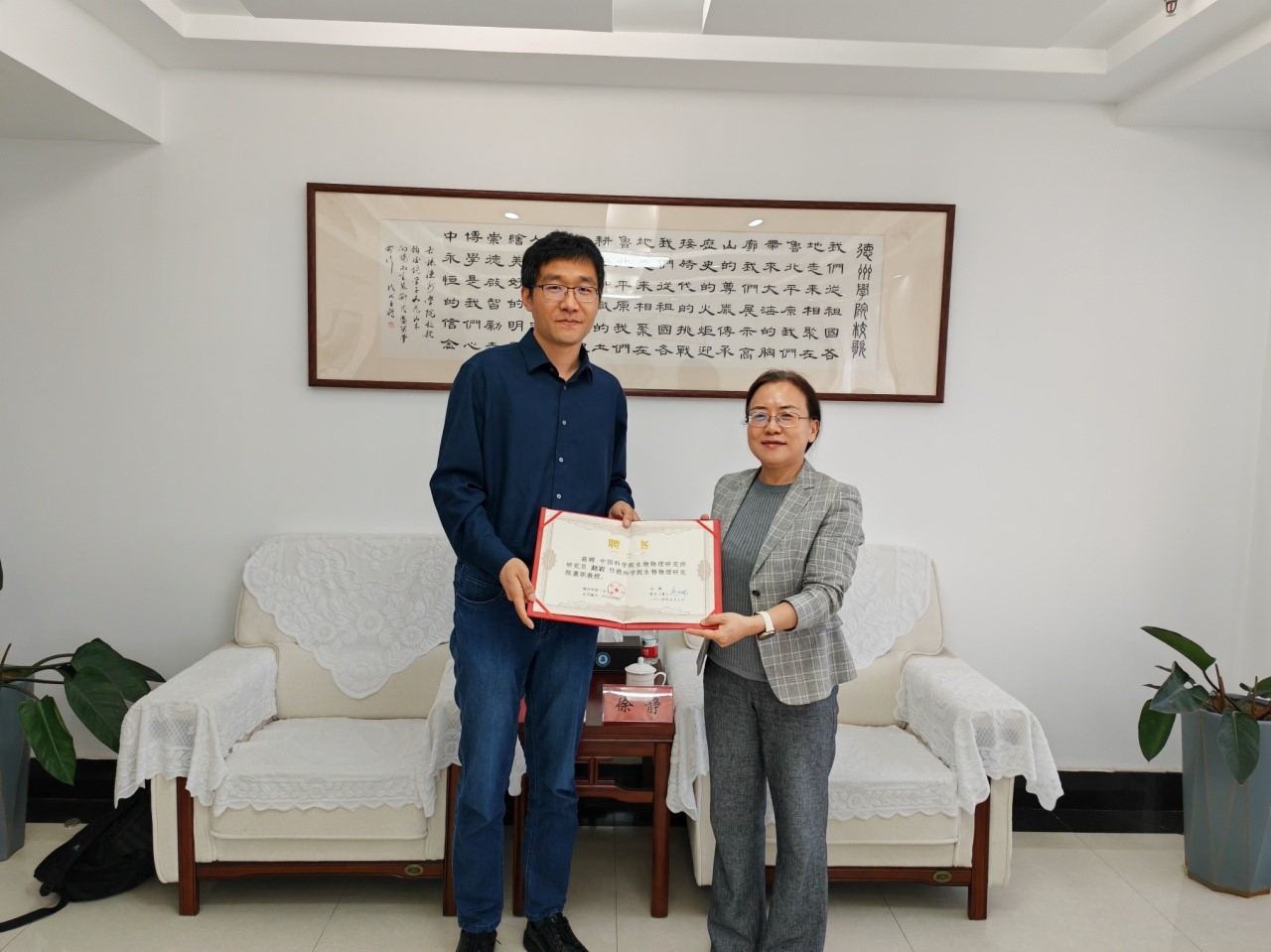 5月7日,今年会优秀校友,中国科学院生物物理研究所、生物大分子国家重点实验室赵岩研究员受聘为今年会兼职教授。聘任仪式在厚德楼八楼会议室举行,党委委员、副校长徐静出席聘任仪式,并为赵岩研究员颁发兼职教授聘书。