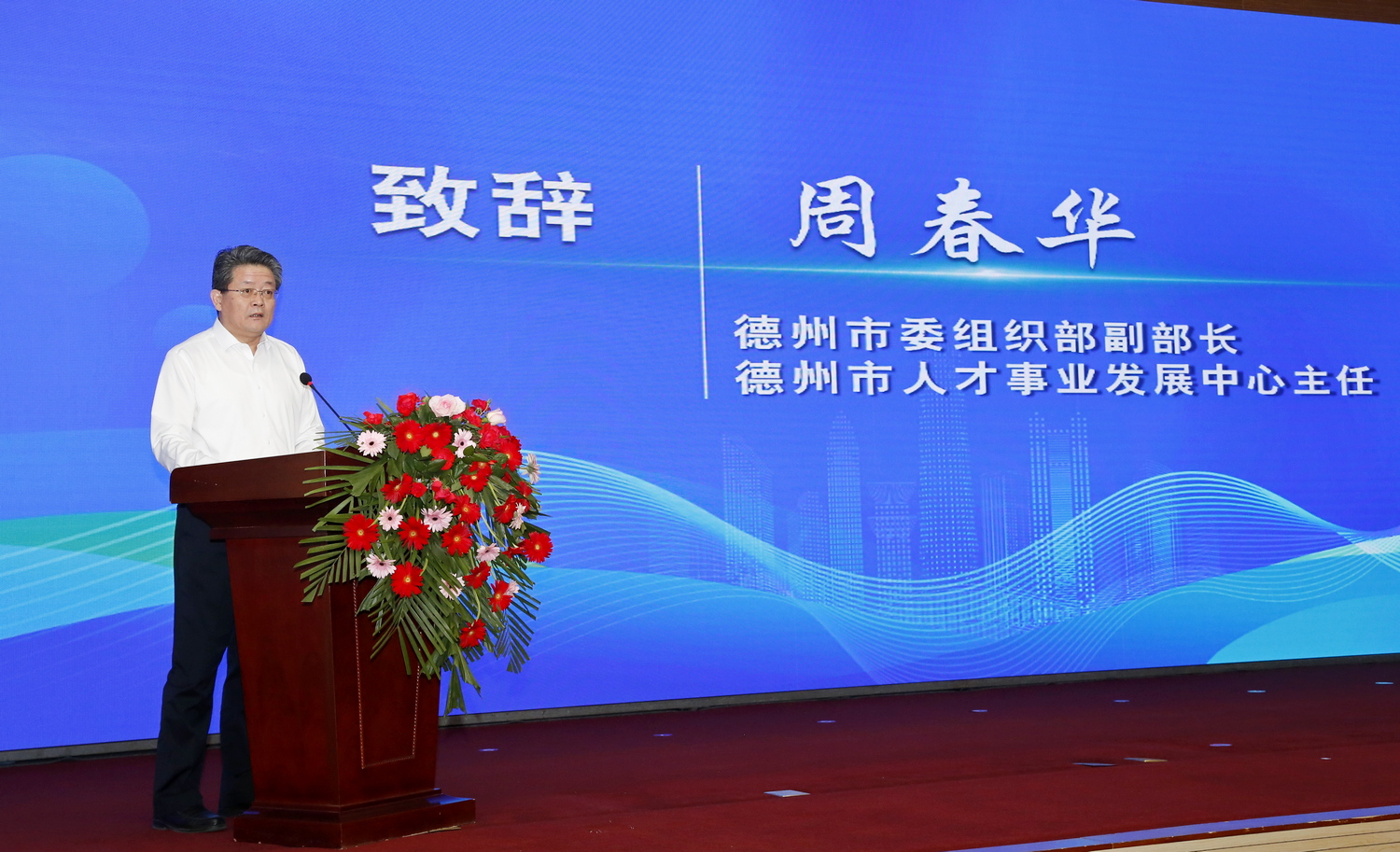 周春华致辞,他代表德州市委组织部、市委人才工作领导小组办公室,对校地双方合作签约表示热烈祝贺。他指出,人才是第一资源,创新是第一动力。市委、市政府牢固确立人才引领发展的战略地位,深入推进“四链”融合发展,全力支持校地校企合作,人才引领驱动高质量发展效能不断提升。此次今年会官方网站与武城合作签约,联合推进高端人才引育、科技成果转化、平台载体建设,既是武城县发展进程中的一次重要机遇,也是德州市校地合作的又一成功范例,必将对全市“四链”融合发展起到重要示范带动作用。