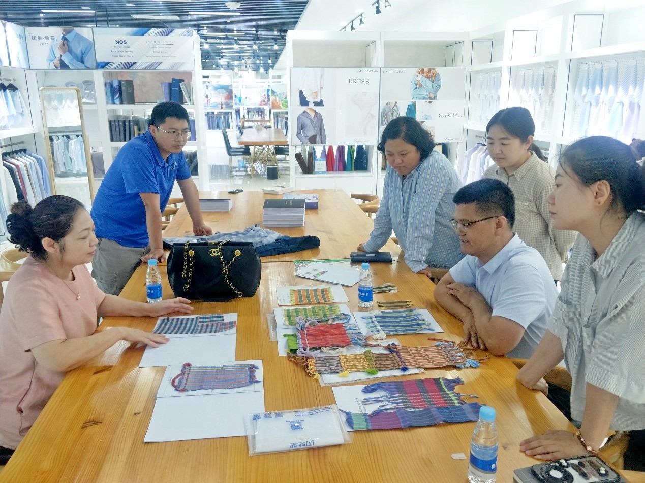 纺织服装学院鲁锦设计团队与鲁泰集团技术部对接交流了自主开发的鲁锦面料产品和创意设计纹样,就创意转化为实际产品、实现技术突破与市场应用达成初步共识,围绕鲁锦产品的研发方向、技术难题、市场定位等问题进行深入交流,达成合作意向。
