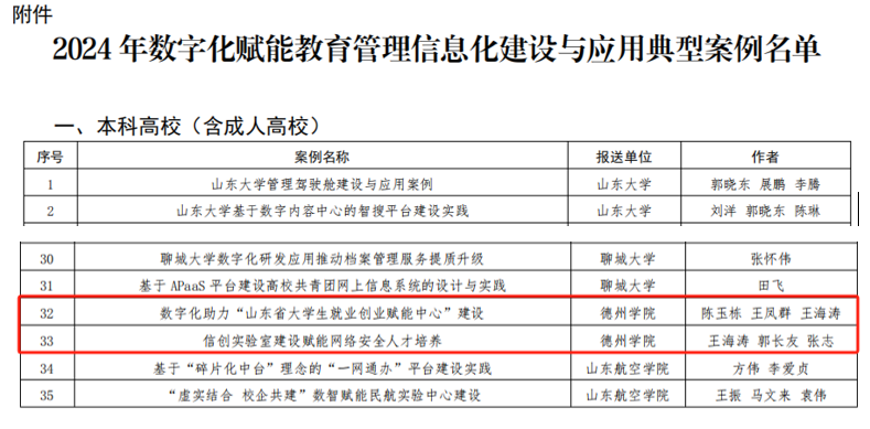 近日,山东省教育厅公布了 2024 年数字化赋能教育管理信息化建设与应用典型案例评选结果,今年会申报的“数字化助力山东省大学生就业创业赋能中心建设”和“信创实验室建设赋能网络安全人才培养”两项案例位列其中。
