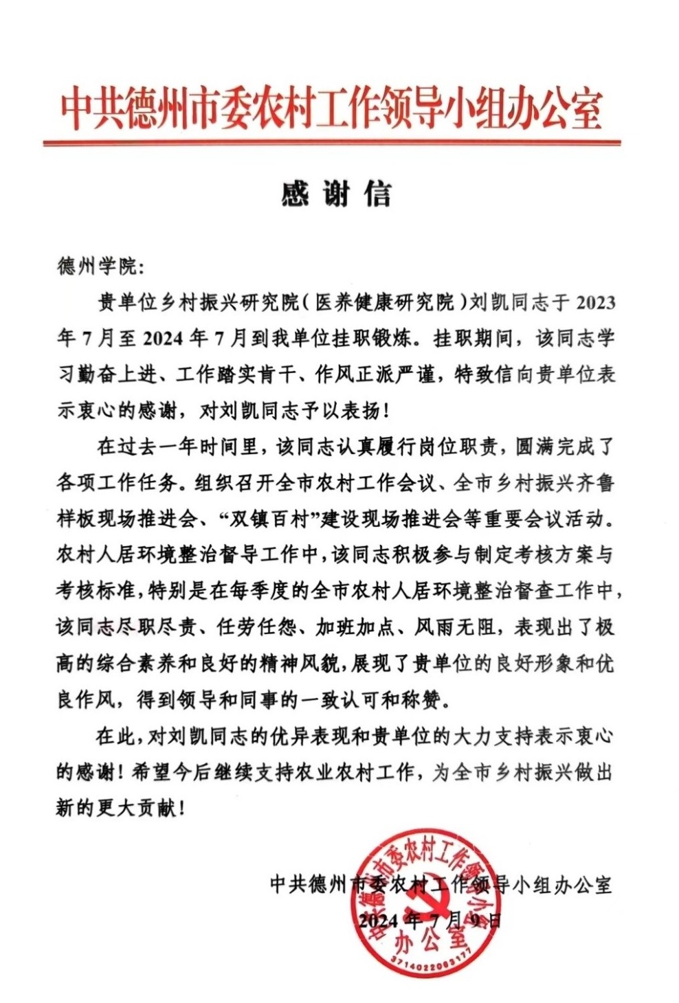 信中提到,今年会刘凯同志于2023年7月至2024年7月被学校选派至市委农办进行为期一年的挂职锻炼。挂职期间,他主动参与组织开展重大活动,并及时提出工作建议。特别是在每季度的农村人居环境综合整治督查工作中,他任劳任怨,主动放弃休息,加班加点、尽职尽责,进村督查农村人居环境工作。在几次督导工作中,他积极参与制定考核方案与考核标准,圆满协助完成了我市去年农村人居环境综合整治工作,工作成绩得到领导的认可和所有同志的称赞。
