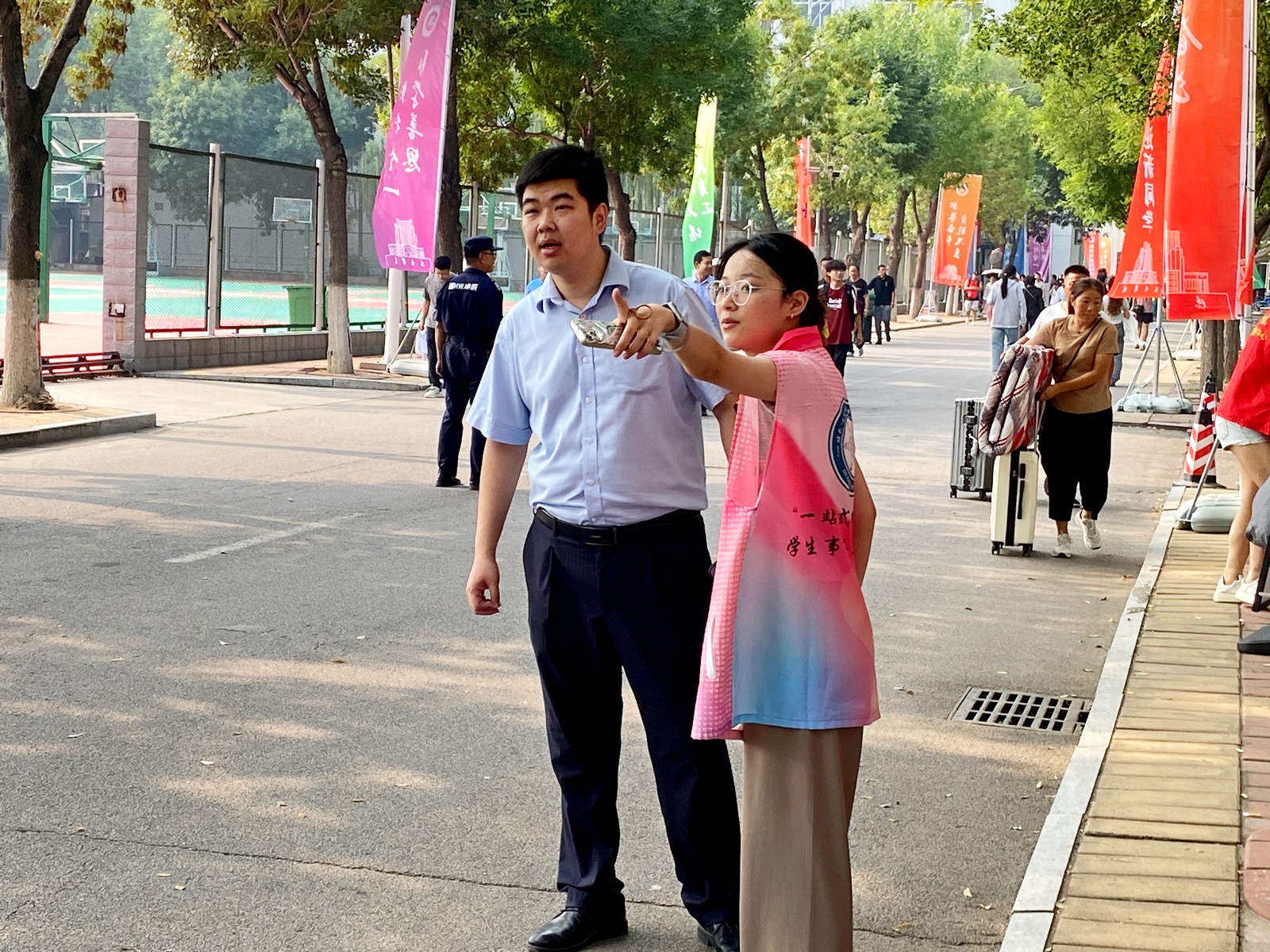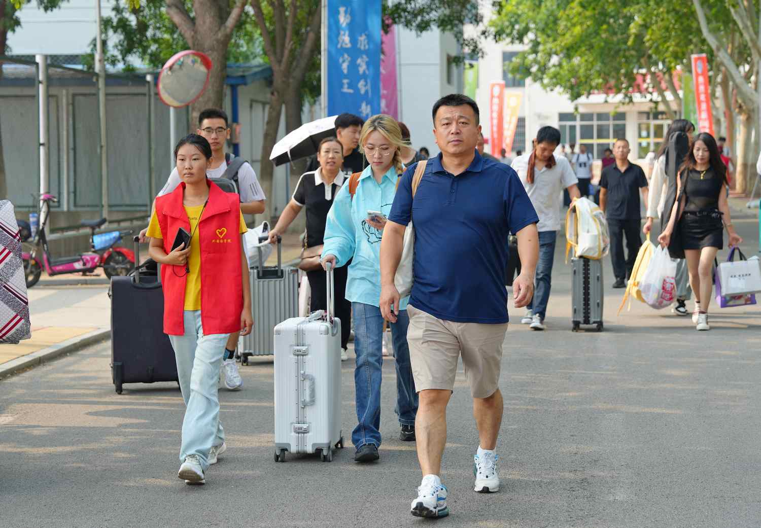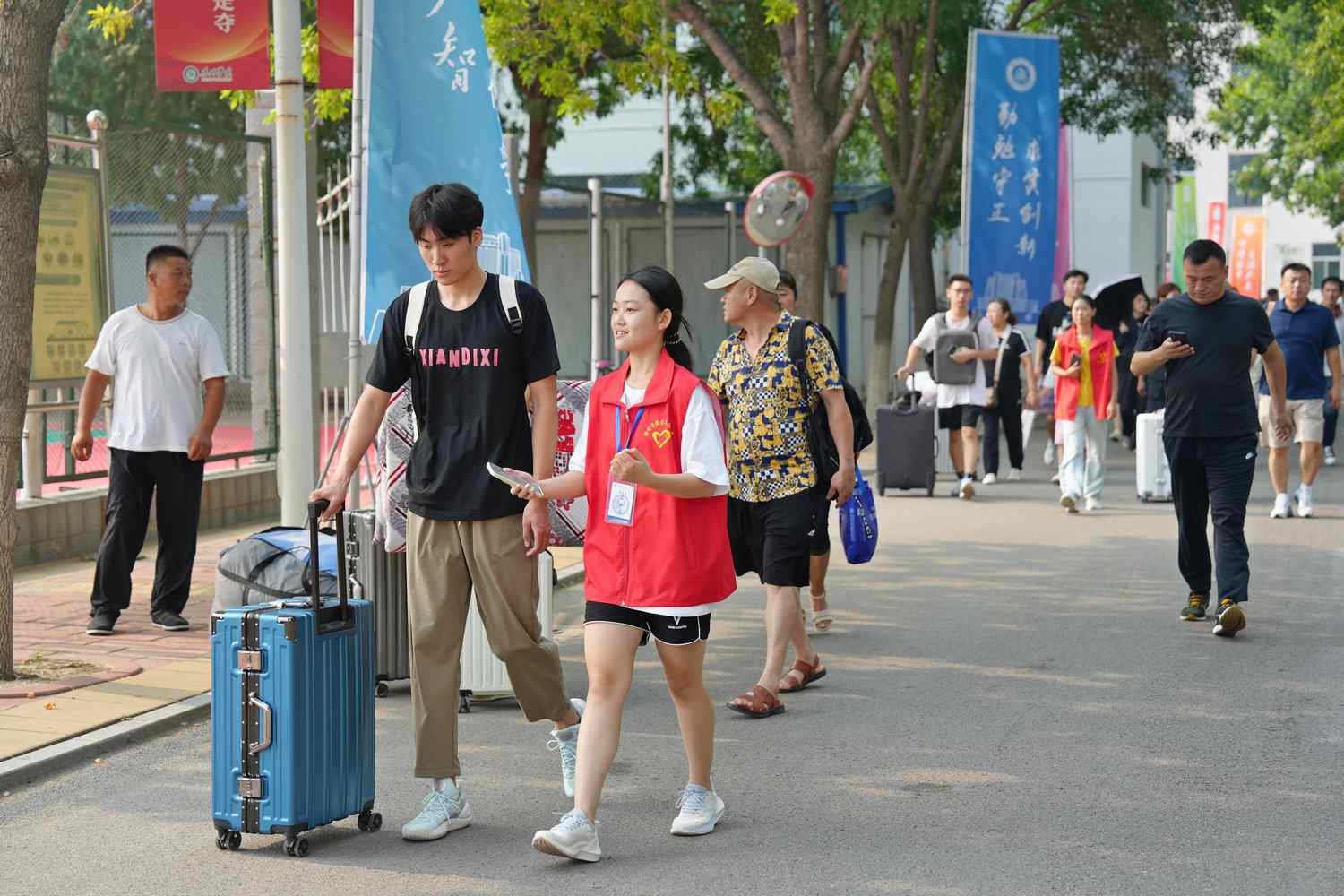 热情洋溢的志愿者们身着红色马甲,为新生报到提供“一站式”服务,成为了一道靓丽的风景线。