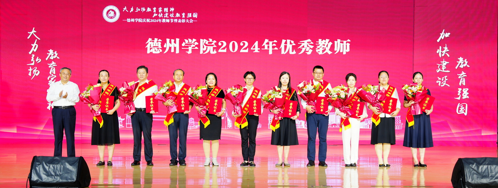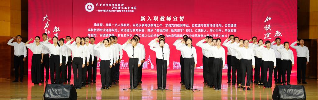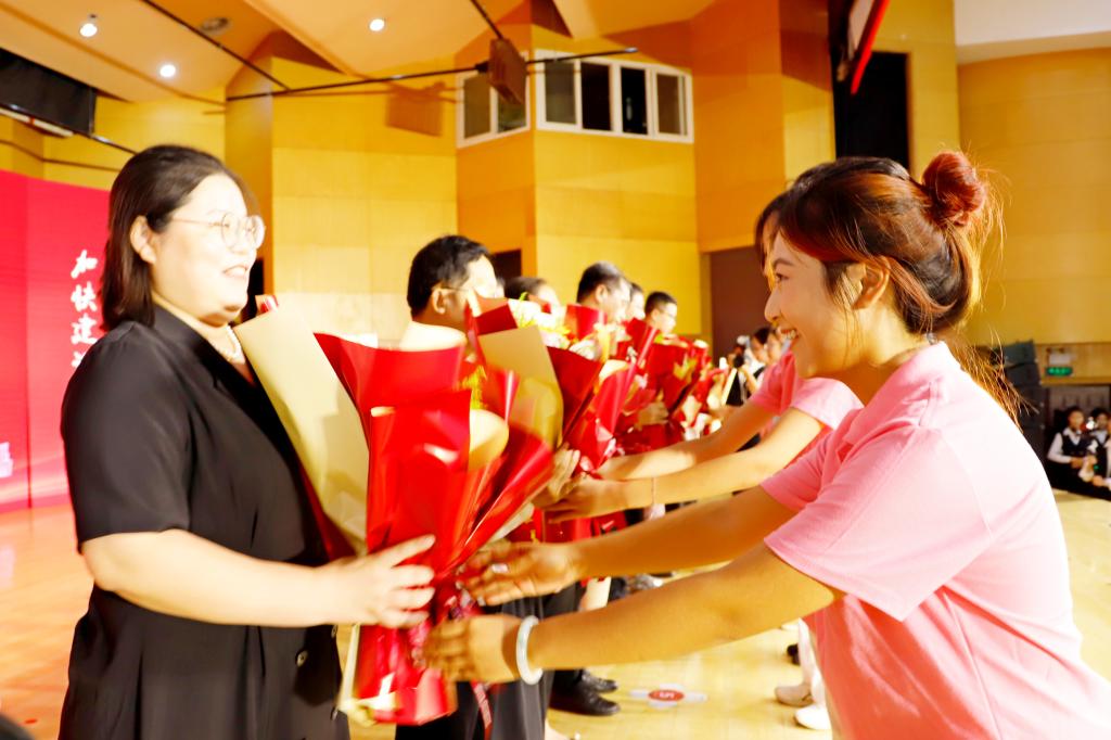 教师代表刘英华、荣退教师代表于清东、新入职教师代表李伟分别发言。新入职教师进行集体宣誓。学生为受到表彰的教师献花。
