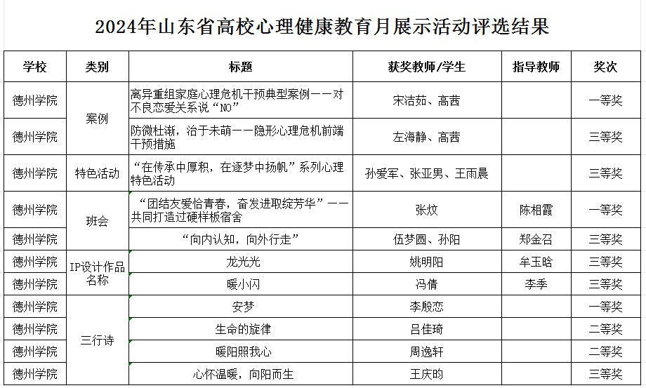 日前,山东省教育厅(省委教育工委)思想政治工作处、山东省高校思想政治教育研究会大学生心理健康教育专委会公布了2024年山东省高校心理健康教育月展示活动评选结果,学校在此次活动中取得了一等奖3项,二等奖2项,三等奖6项的优异成绩。