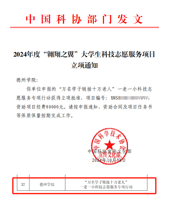 近日,中国科协公布关于2024年度“翱翔之翼”大学生科技志愿服务项目立项名单,由校团委负责申报的《“万名学子链接十万老人”一老一小科技志愿服务专项行动》项目获批立项,是山东省高校唯一立项单位。